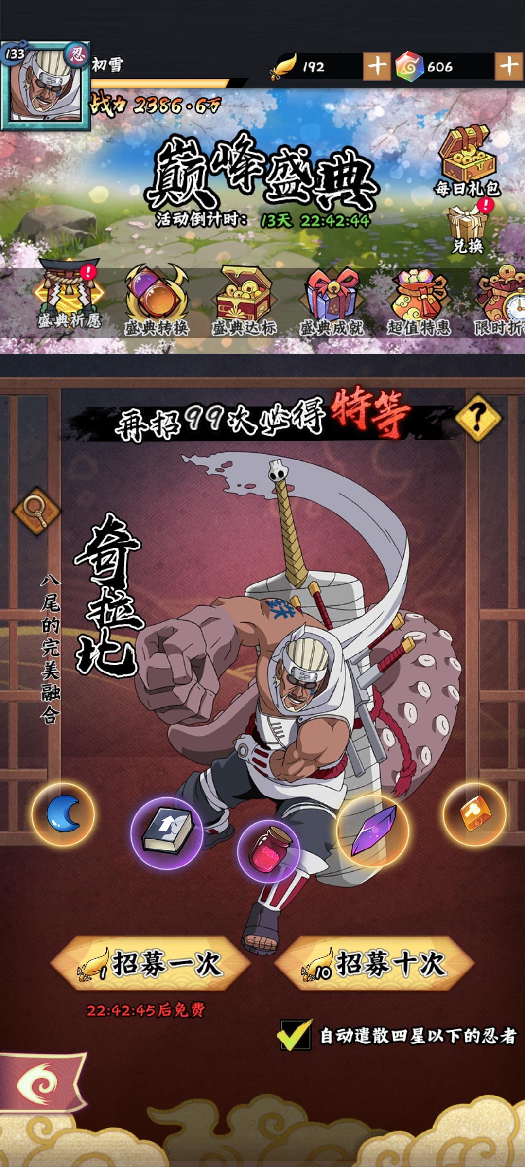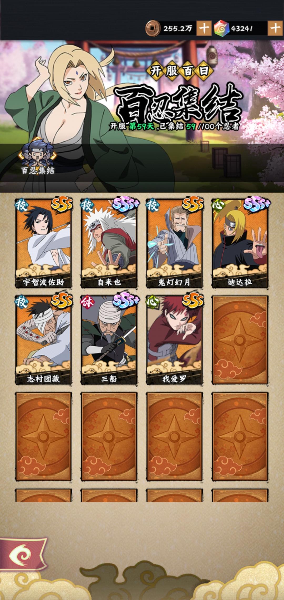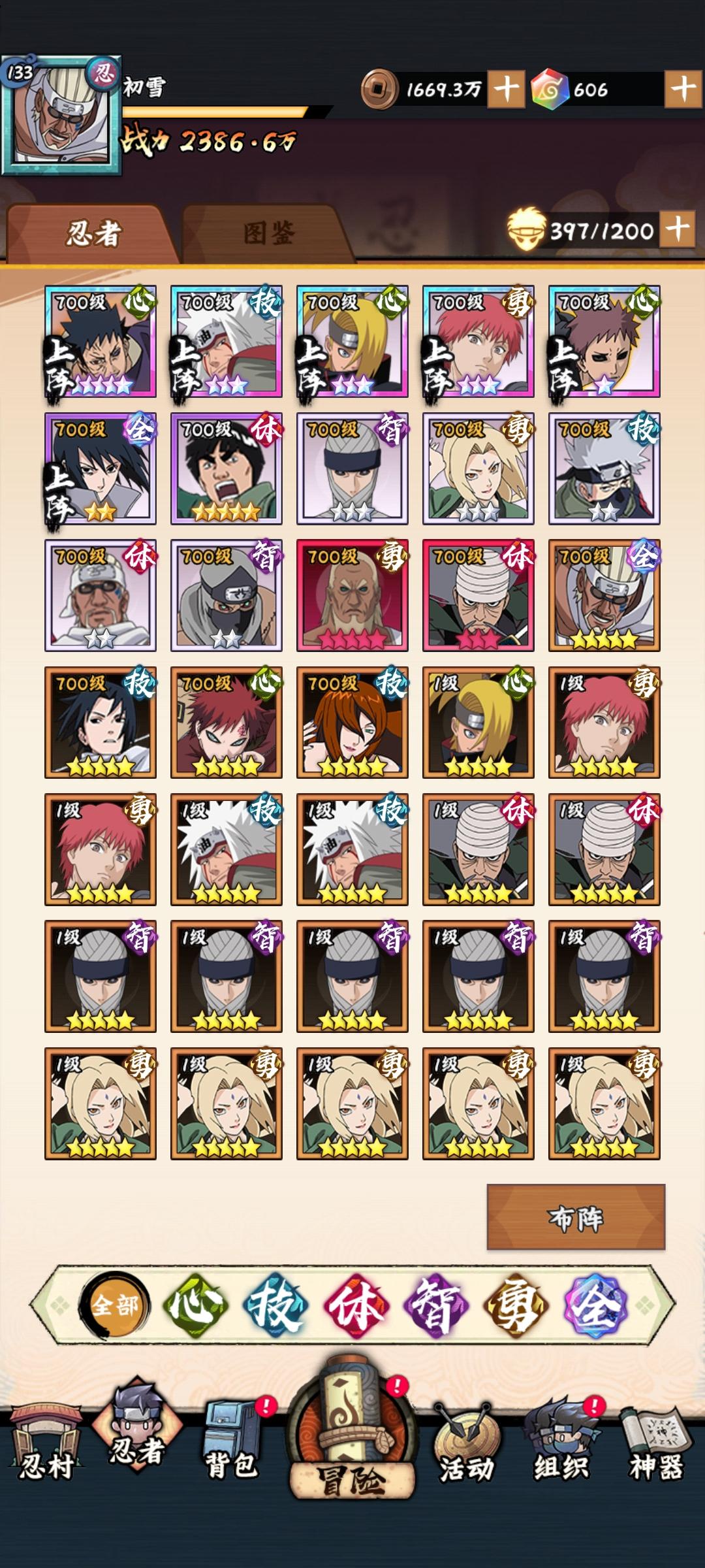 小小永久卡,目前开服快60天。开区刚好遇到佩恩限时,入了易伤的门。有一说一,佩恩在刷资源方面是独当一面的,卡拉比在九尾中的表现也很亮眼。所以前期走易伤路线会比较顺溜。提战力的核心,应该是神奇觉醒方面,每次活动的签子都是必买的,攥到300抽就抽神器。人物的战力主要在专属方面,优先升到金一,专属佩恩优先到二十,其他十基本够用。未来转型火队,歇置换成带土,再养个自来也。通灵方面来只火鸟。那么两队队形