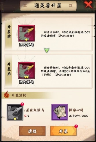 哈喽大家好,我是你们的老朋友团藏,今天来给大家带来的是通灵兽怪鸟的实战测评,下面就来看看我给大家带来的详细内容吧。 一、通灵兽定位与核心机制 功能性通灵兽,开局给敌方增加灼烧状态,给全体造成伤害,并且对附带灼烧效果的敌人造成伤害提升15%,受到附带灼烧效果的敌人攻击时降低20%伤害。 二、升星阶段全解析 1)1星→2星阶段 效果变化: 新增:30%概率附加1层灼烧效果 消耗:1个1
