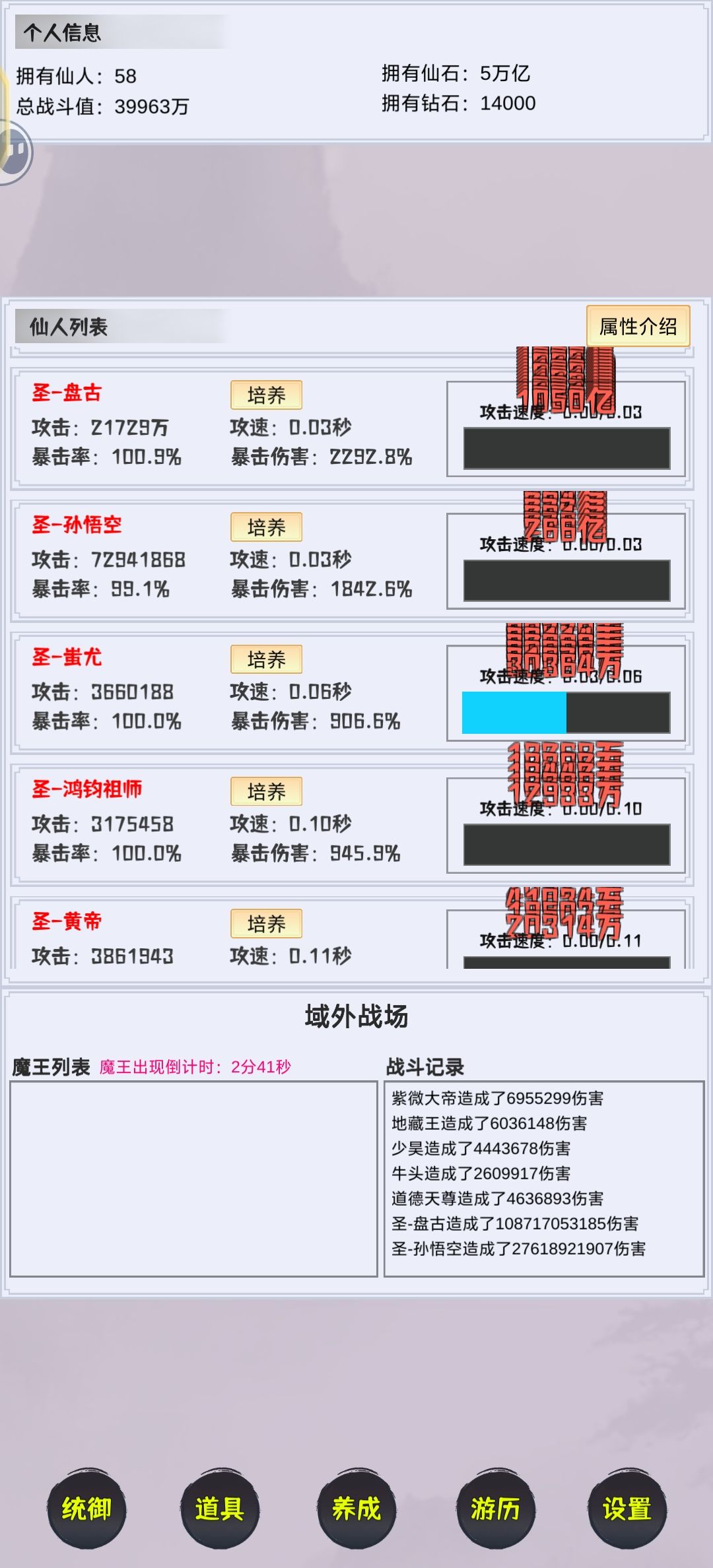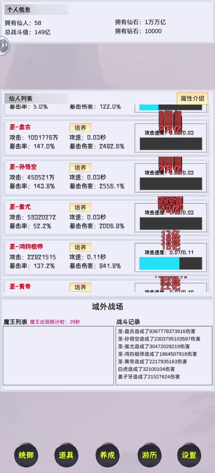 开局先签到,拿10抽,第一个10连肯定出红,这里推荐3个人物,鸿钧祖师,蚩尤,准提,因为是全体收益,前期比较划算,只要人多都有加成。 然后看5个广告,任务里面再拿10抽,继续抽人物。然后看广告继续抽,20个以后就免广告了,赚得钻石继续抽。红人物提升还是很大的,尤其是全体收益的技能。 钻石抽完了,就可以正式玩了,每个人物随便升个100级,去爬塔,有木头收益那个,随便打打,第一层+100/5分钟,后面