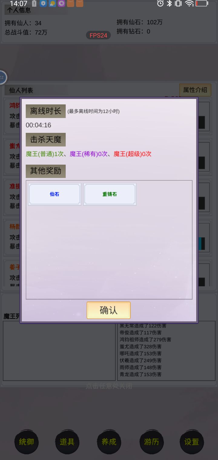 游戏还行,就是挑装备的时候肝了点,需要比较属性,其他就是挂机。这里有个技巧,挑一套最好战力的装备就行,其他小弟随意带下就行。魔力石很重要,后期特别缺,主要是成功率太低了,符魔成功属性翻倍。这里有2个词汇最重要,必定暴击,和速度翻倍,有了必定存着不要分解了,特别稀有,把最好词汇的给最牛的人物带上,仙石全靠他。 后面挑战仙人就把战力最好的装备卸下来,给有伤害的小弟带上去挑战就行。 钻石什么都不要买,就