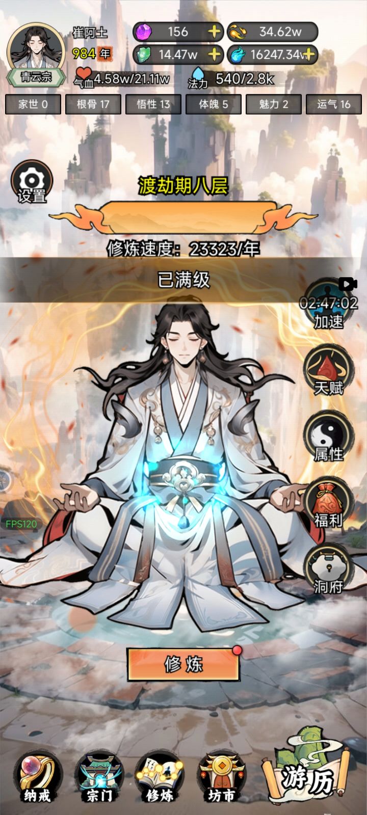 怎么说呢,数值广告游戏相当于是,不管看不看广告,主线往后推包有推不过的怪。然后要么看广告要么耗时间。第一次刷没搞宗门,第二次刷搞了阵法。这个数据应该是大部分人第一次刷不到的,照样金丹元婴主线过不去。总结来说就是:实力不详,遇强则强(主线)