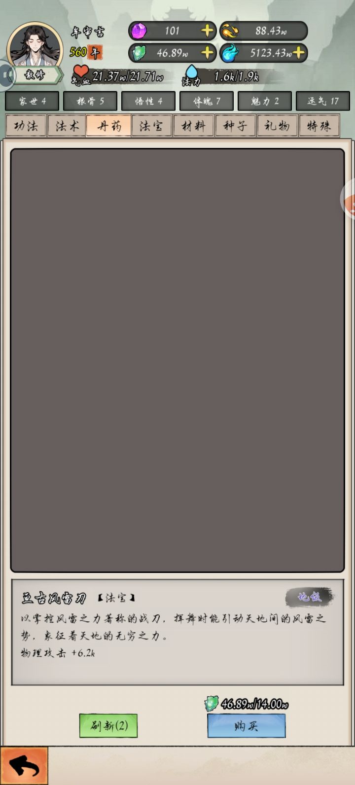 玩法现在有点少,弟子这一块是个bug,招了六个弟子只能培养一个还不能装备功法和法宝,其他五个看不见,可以借鉴一下《修仙家族模拟器》里面的培养弟子与攻阀领地战这样不会无聊。这个游历太少,一跳几十年…
