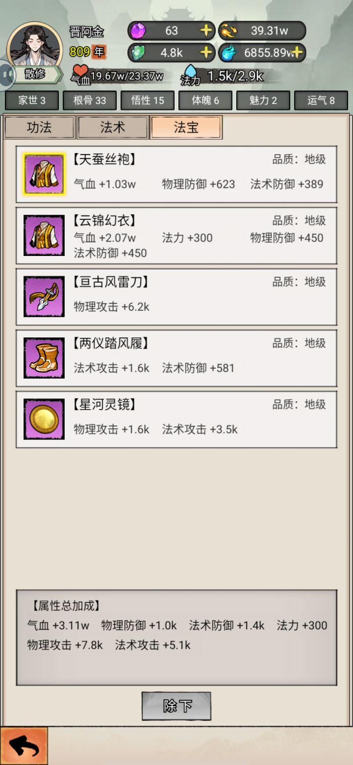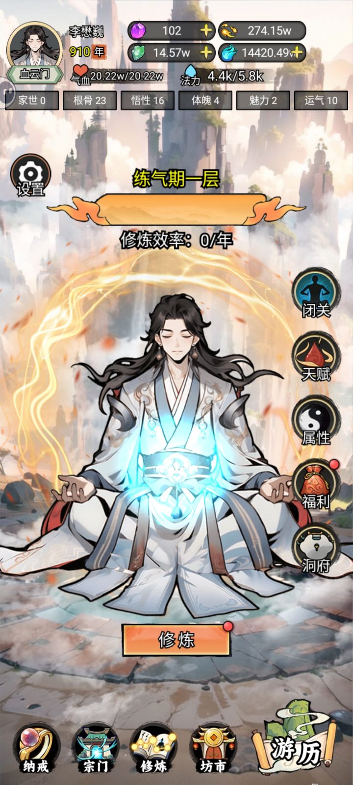 玩法现在有点少,弟子这一块是个bug,招了六个弟子只能培养一个还不能装备功法和法宝,其他五个看不见,可以借鉴一下《修仙家族模拟器》里面的培养弟子与攻阀领地战这样不会无聊。这个游历太少,一跳几十年…
