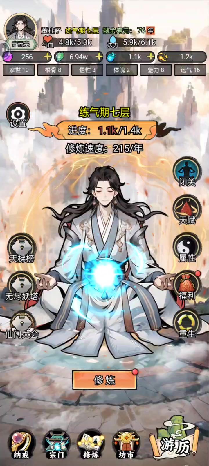 玩法现在有点少,弟子这一块是个bug,招了六个弟子只能培养一个还不能装备功法和法宝,其他五个看不见,可以借鉴一下《修仙家族模拟器》里面的培养弟子与攻阀领地战这样不会无聊。这个游历太少,一跳几十年…