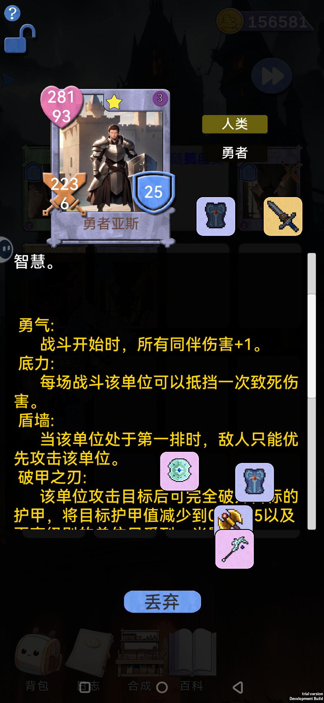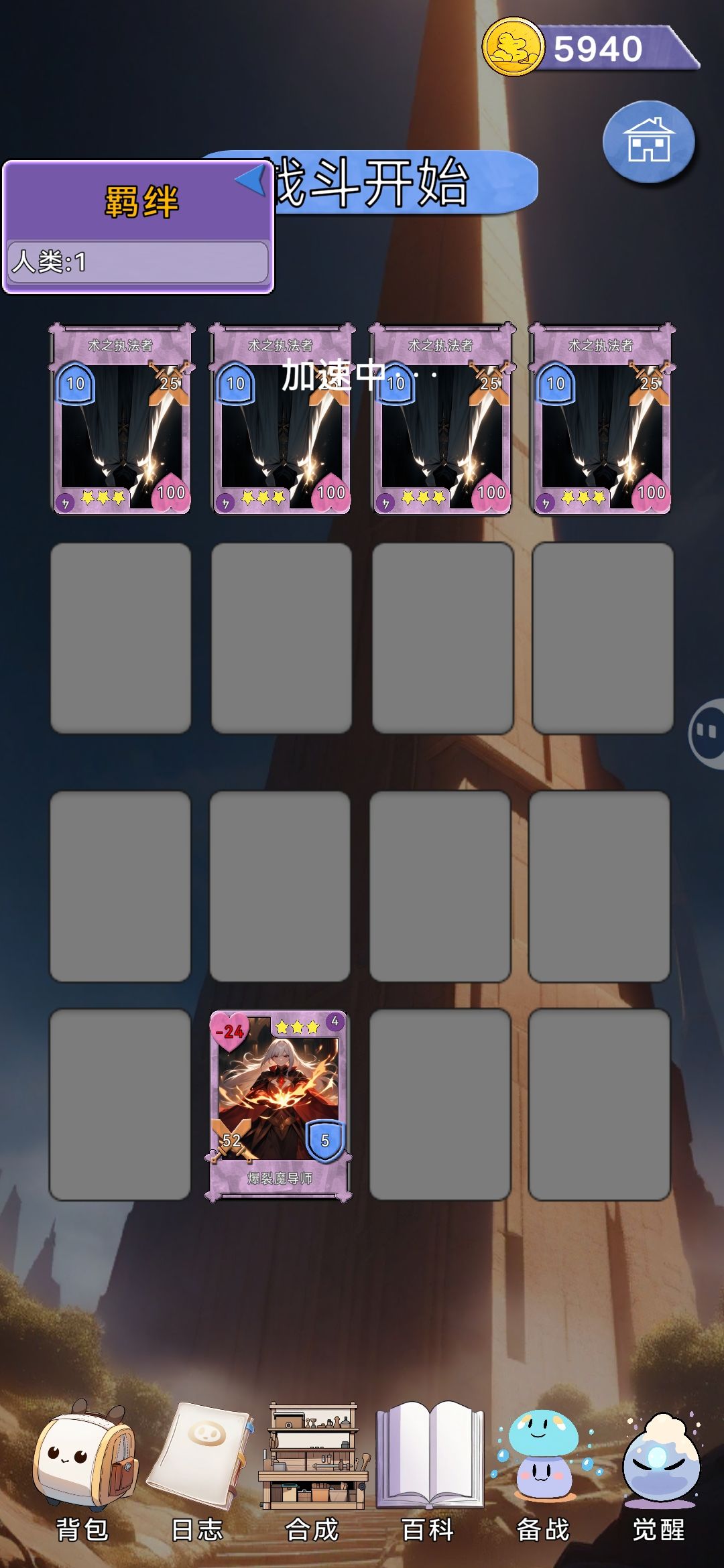 自找痛苦模式启动 适用各种难度 前期刷到一本书 俩本更好 带一个没有用的眼镜哥[表情_举手] 接下来小手来回切换前排英雄 分担伤害 痛苦面具的同时 看到攻防属性加一 加一 再加一 [表情_酷] 多走怪物关卡 拿到人类前排过度 在保证经济不低于300的情况下 通过憋屈的第一关[表情_惊恐] 第二关开始找到 2级全知女神的的专属大姐[表情_开心] 接下来就是拿书 给史莱姆粘液 摸装备 以及非常开心的