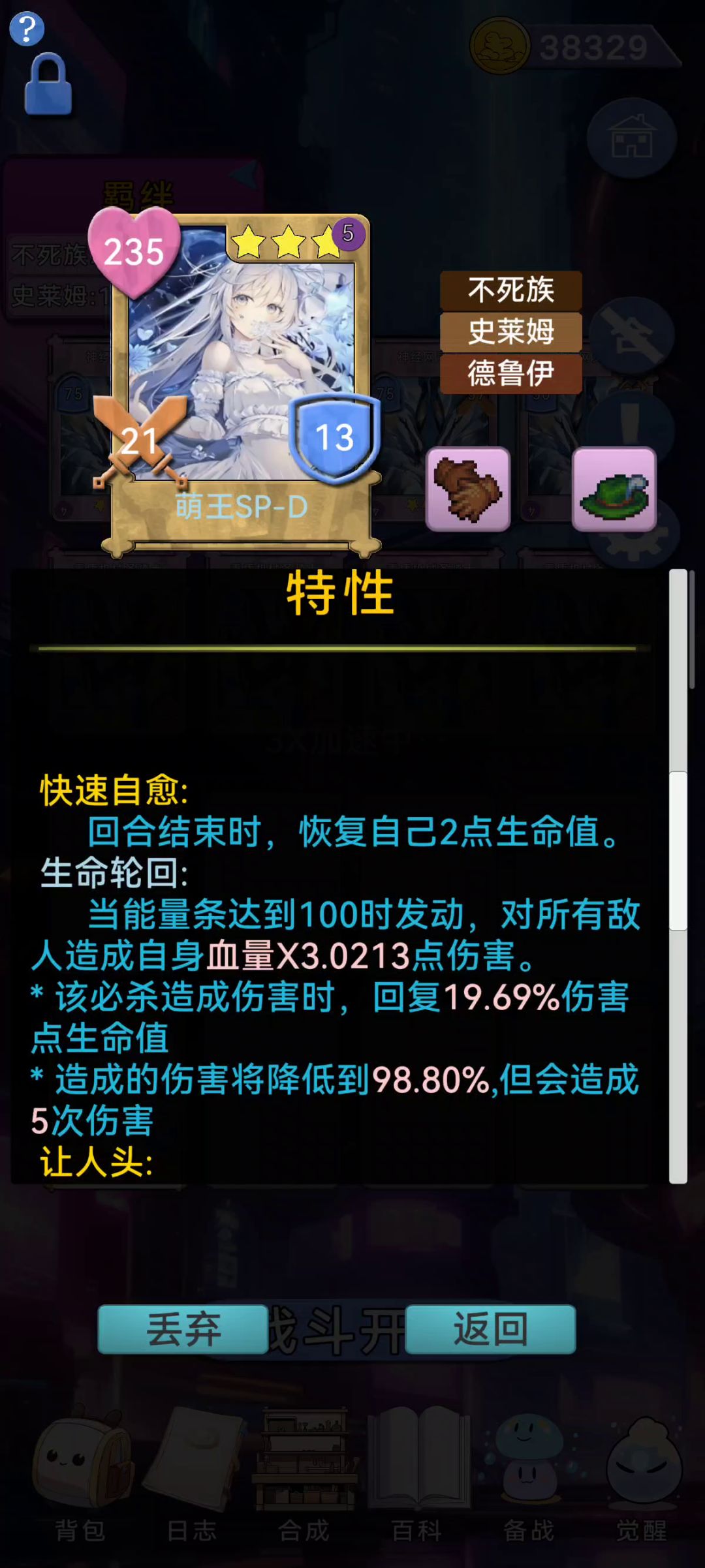 基本原理:掉渣刷基本属性保证攻击破防,吸血提高血量,血族种族天赋超越人类血量转攻击,反复叠攻击,明净保证攻击不会被神王反转。 制卡需求: 1.模板种族要求:1或2级(2级需降级)血族+其他无一级单位种族(如恶魔、精灵等,不推荐神使)(最好单血族) 2.特性点要求:最低45点 3.远近战要求:远程有数箭才能速刷!!! 4.面板及特质要求:不想多买的话防御10以上,无所谓可局内买两个,7就可。血>防,