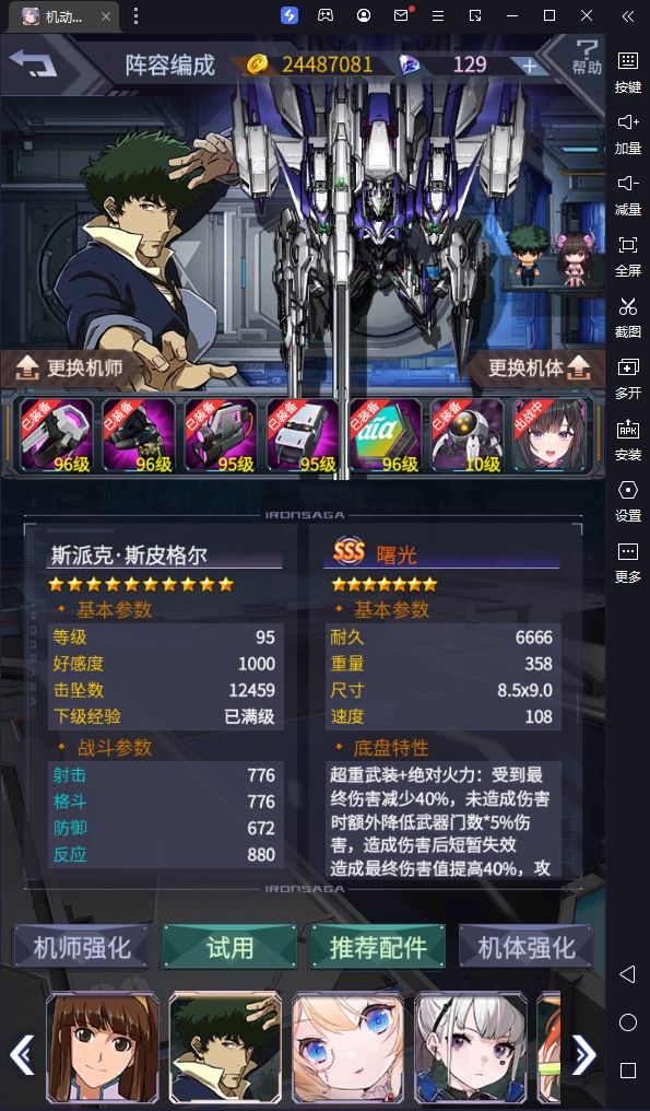 应该挺低配的了吧?由于我没有猴子,所以只能再上个近战带锤子了。至于为什么带了个姨妈后还带了个短剑,是因为姨妈反隐不是百分百会翻车,所以上了短B反隐,上了后懒得换机师了。 总结 任意近战(不会被蝠翼秒的那种)加无双带硾子锁动作。有猴子的话,一台猴子就够了。 曙光打主c,我的曙光还是七星改底盘武器的。有静流的话就上新机师的攻击位,没有的话就愉悦怪。