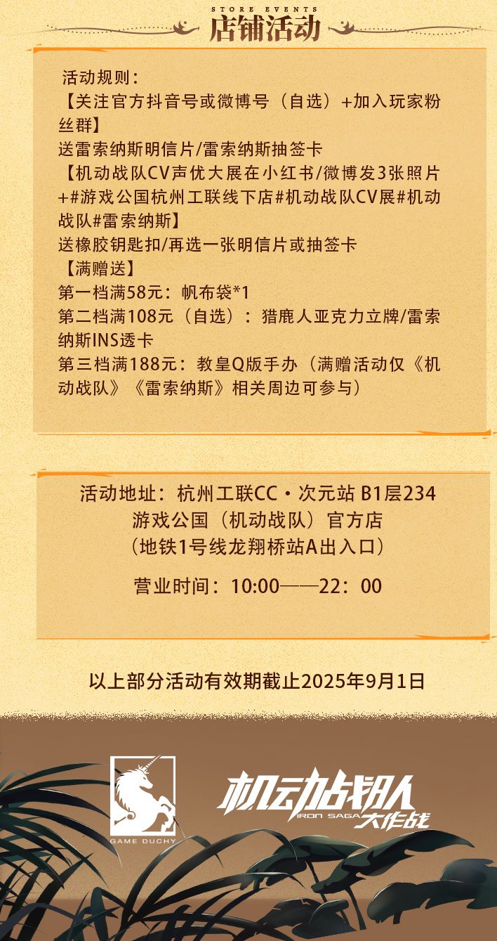 游戏公国(机动战队)线下首店已正式营业,欢迎进店线打卡,探店更有福利相赠,走过路过不要错过!!!地址:杭州工联CC次元站B1层234 游戏公国(机动战队)官方店