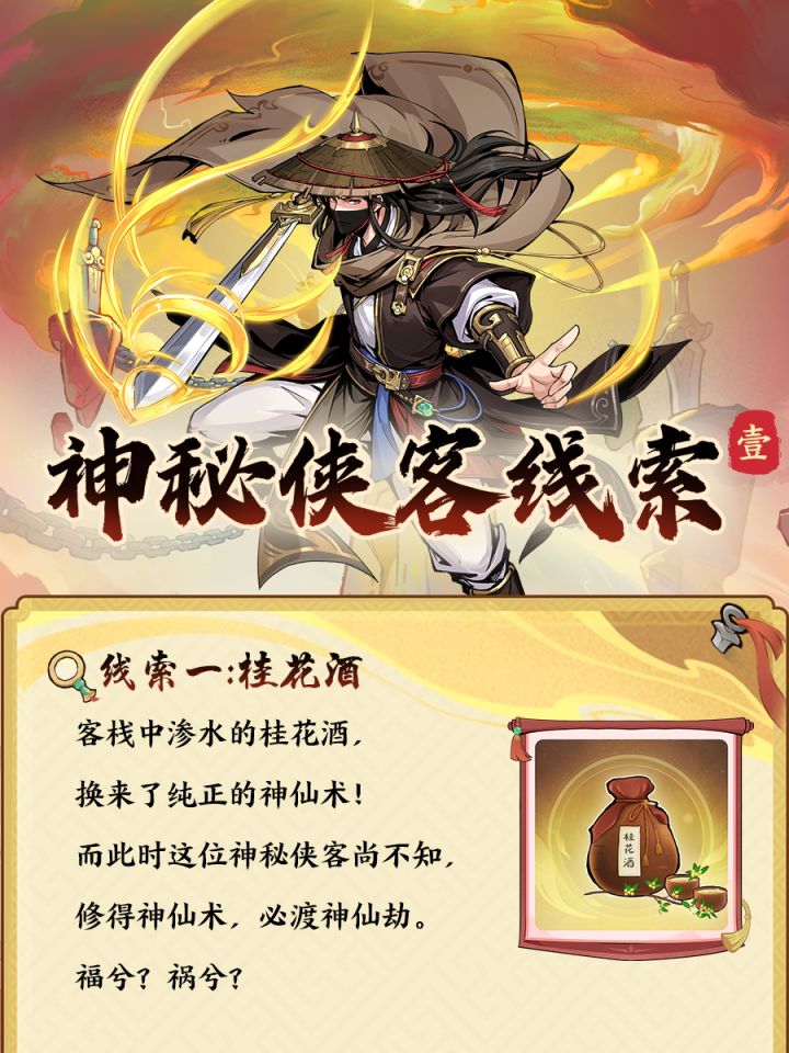 哈喽,侠客们,欢迎进入小小英雄的武侠世界!官方大大更新了有新的侠客来袭!小虾米根据一张模糊的图片推测可能是与【仙剑奇侠转】联名,推出新的蜀山剑客李逍遥!最新兑换码~冰魄穿云掌 游戏圈福利多【桂花酒】今天官方大大公布了第一条线索——桂花酒!让侠客预测锁定李逍遥,因为线索中说用客栈的桂花酒换来剑术,让我们想到李逍遥在客栈当小二时给了酒剑仙一壶桂花酒,习得御剑术,在仙灵岛与赵灵儿相遇,然后从此御剑行