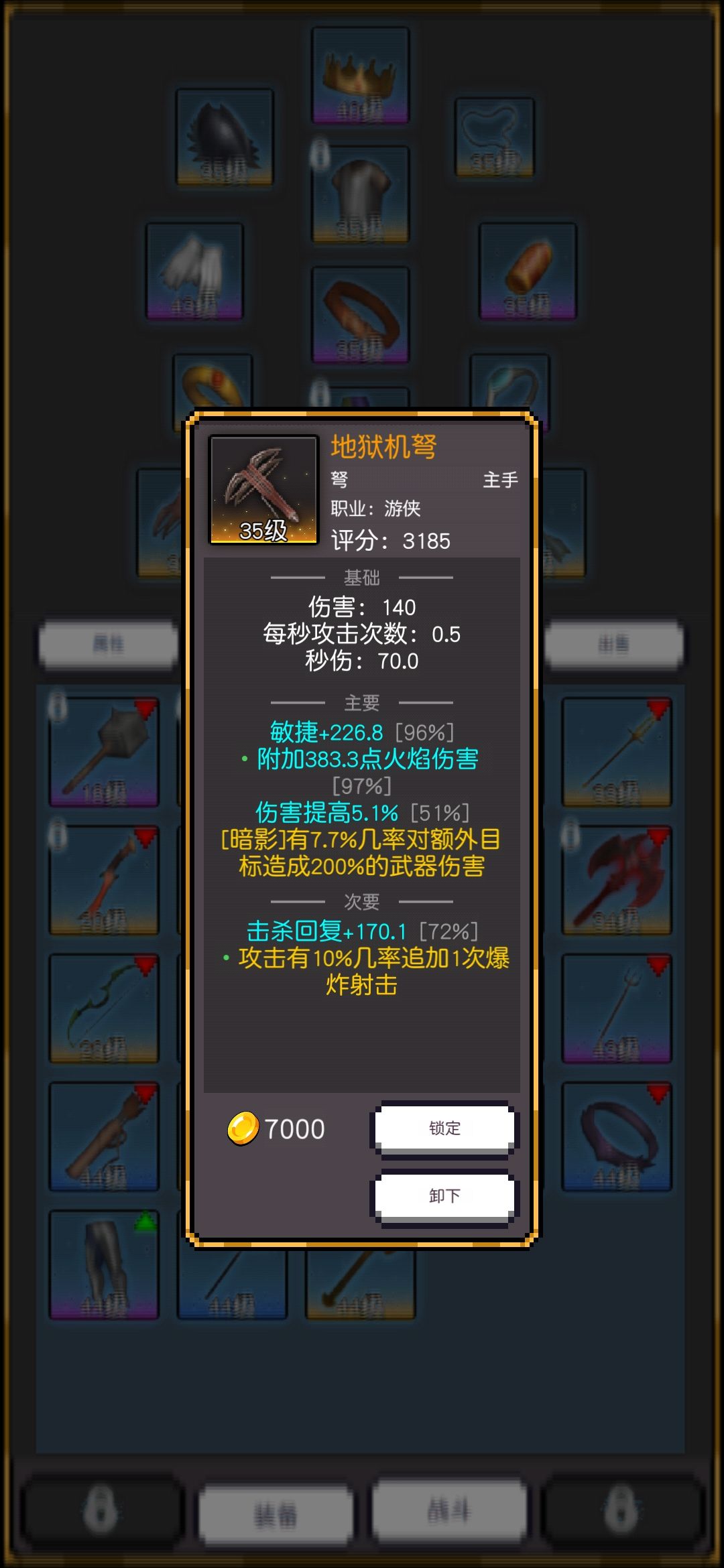 这套BD 属性不需要冷却 攻速最好有70+ 保证两次溅射就触发CD 如果实在没有也没关系,3次触发特效也问题不大,主要扫射触发瞄准 来实现一秒多次瞄准打伤害 提升扫射CD 这里注意,是攻速,因为你穿了4刀锋 扫射冷却是攻速改变的。 如果遇到单个怪半天打不死,可以切一下专精到对单那个,打完切回来。我一般不切。切的麻烦。 主要属性选择 敏捷 体力 暴击 爆伤 躲避 头盔 套装 属性 高敏 高 体