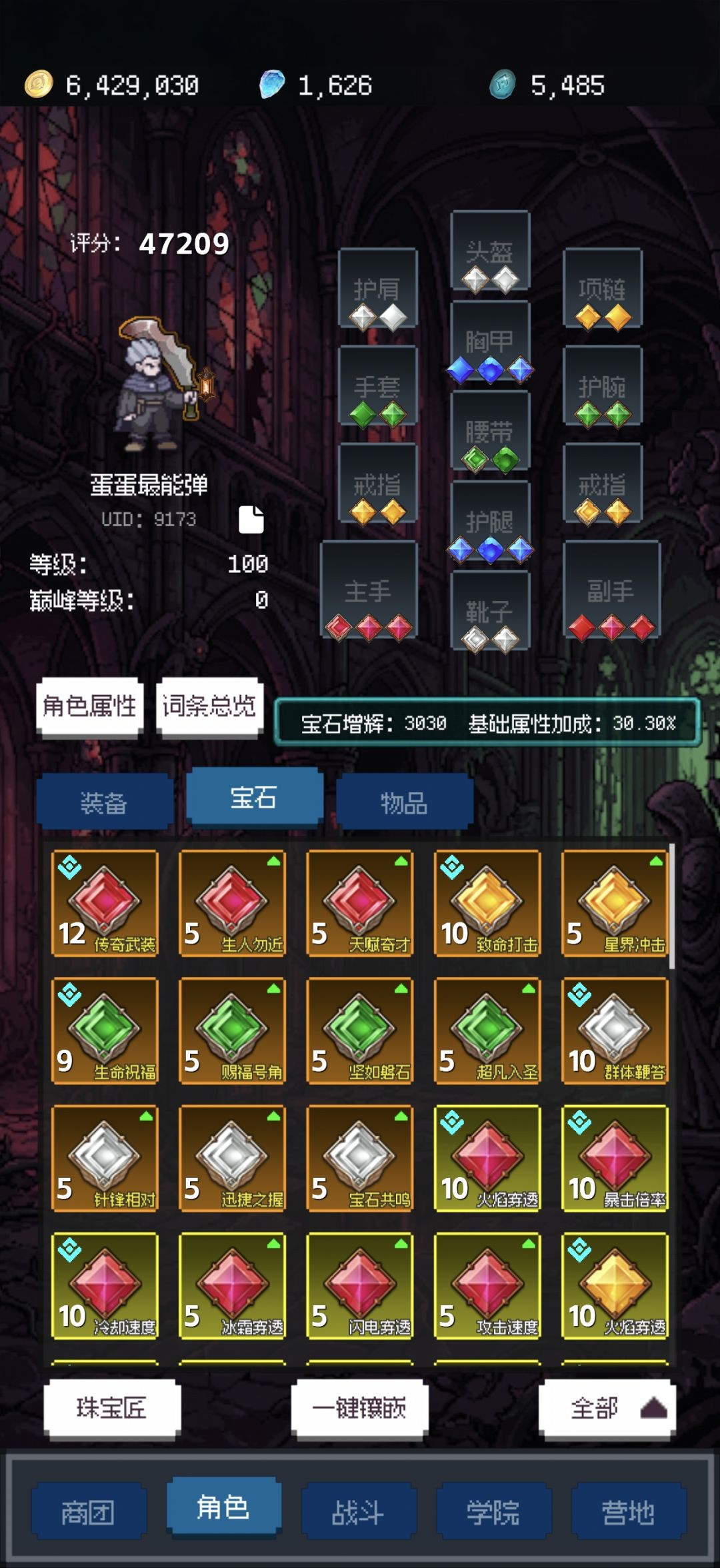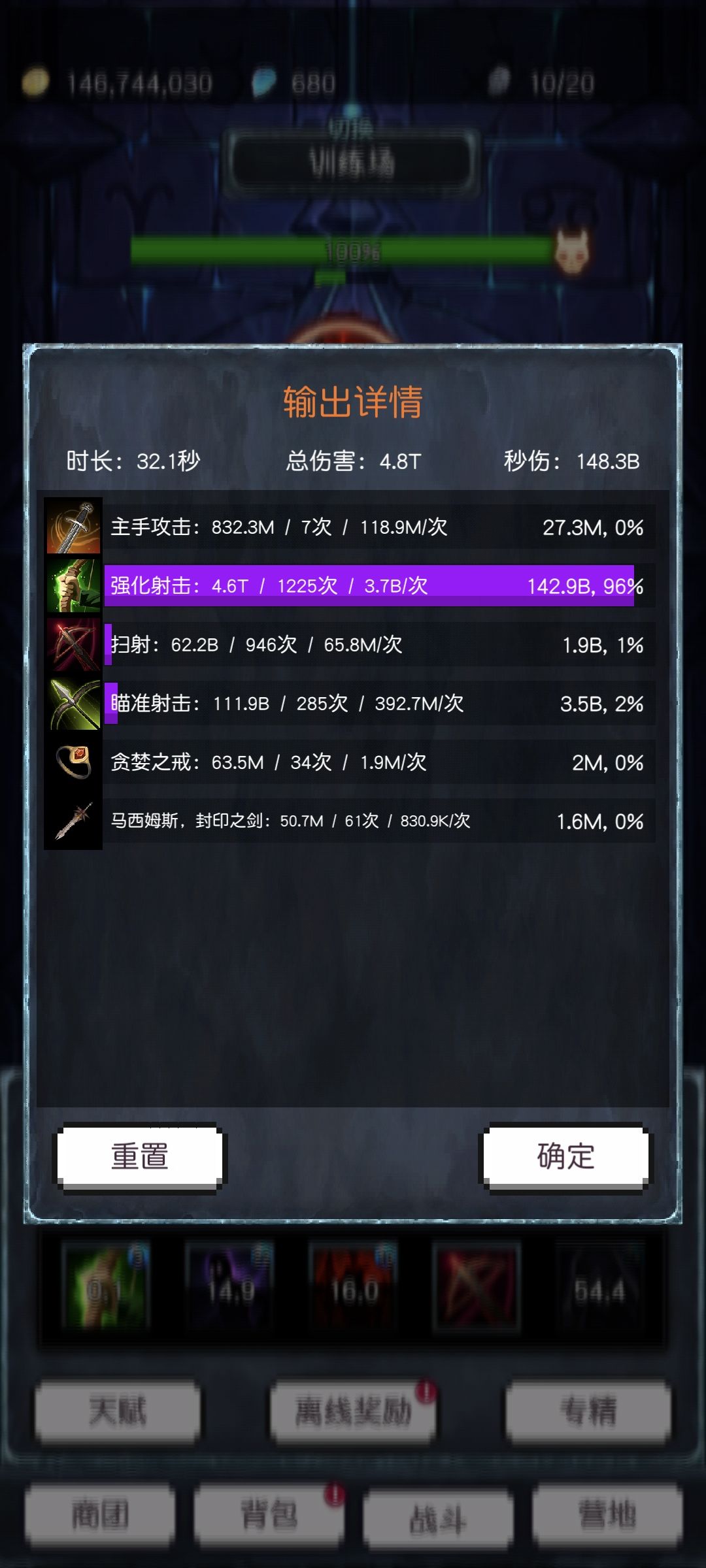 装备天赋如下图,关卡挂99层。注意这套配装只适合打秒金不能用来打秘境!打秘境可以看我另外帖子娜装配装。 这套打到400+没问题,我这426是以前版本打的,现在最高秒金上限是435,秒金没以前好打了,开个月卡提高10%金币获取也能容易点。还有打的时候最好用分屏大法,缩短怪物与人物的距离,加快每一波的遇怪时间。