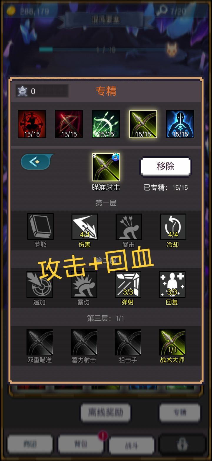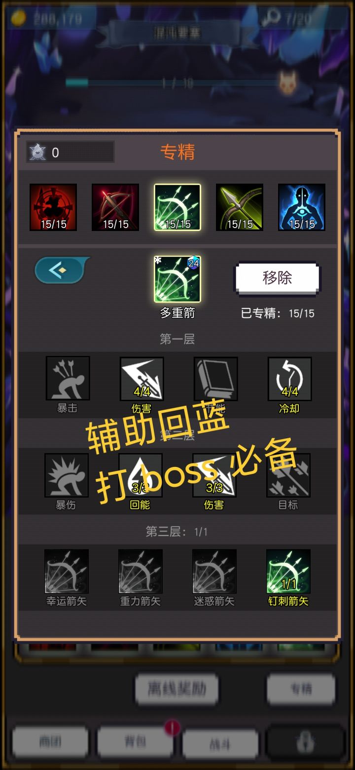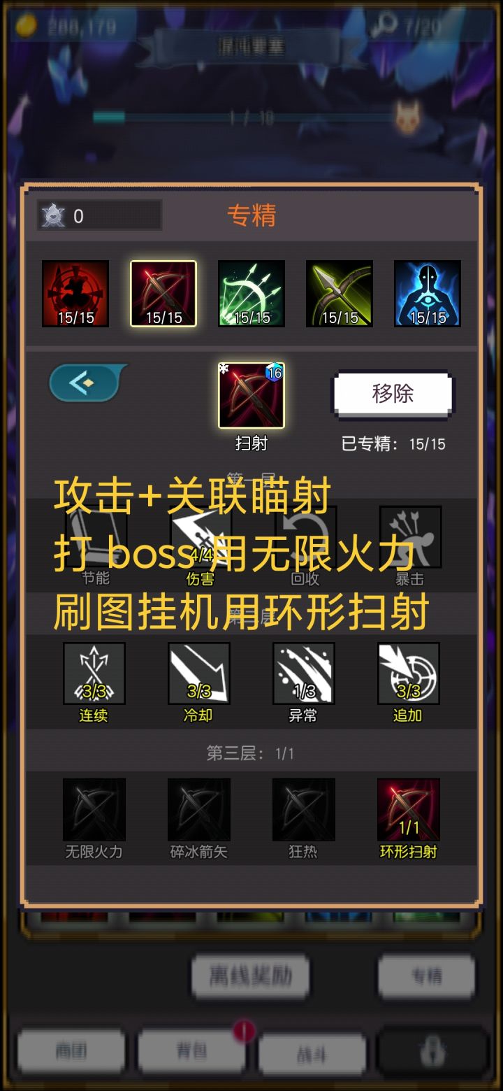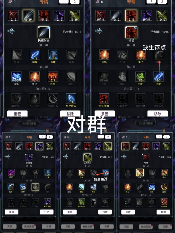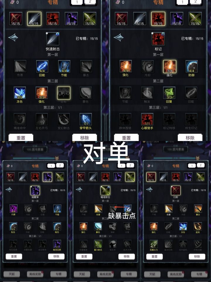 首先通关不会一帆风顺,肯定会卡关!特别是带荆棘的反伤怪,解决办法是(堆血+晕+命中回复)回血 >反伤1、技能选择如图本人尝试多种技能配合,还是如图比较合适前期:扫射+瞄射+标记扫射--刷图用环形扫射,打 boss 用无限火力瞄射-可选暴击/弹射(看刷图打boss 效率程度更换)辅助技能:标记+集中精神(如图配置即可)*多重射击*(重要)刷 boss 和回蓝必备刷图可调整目标和幸