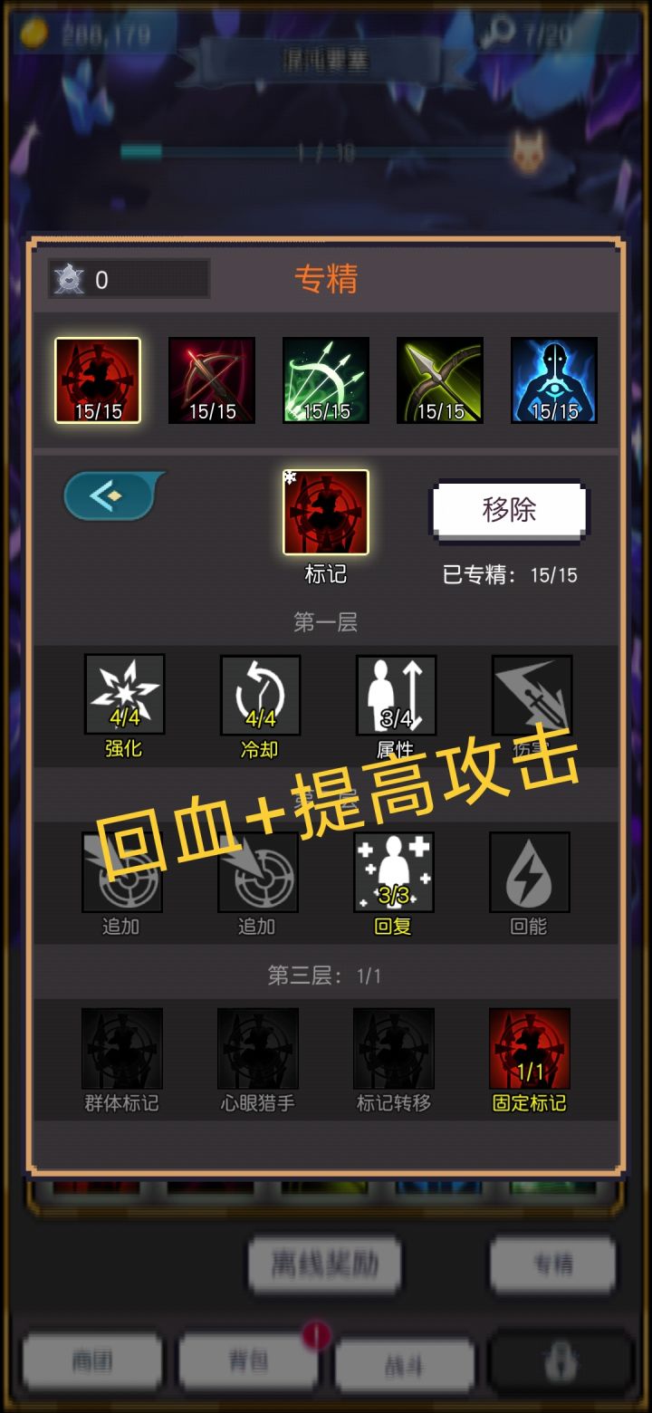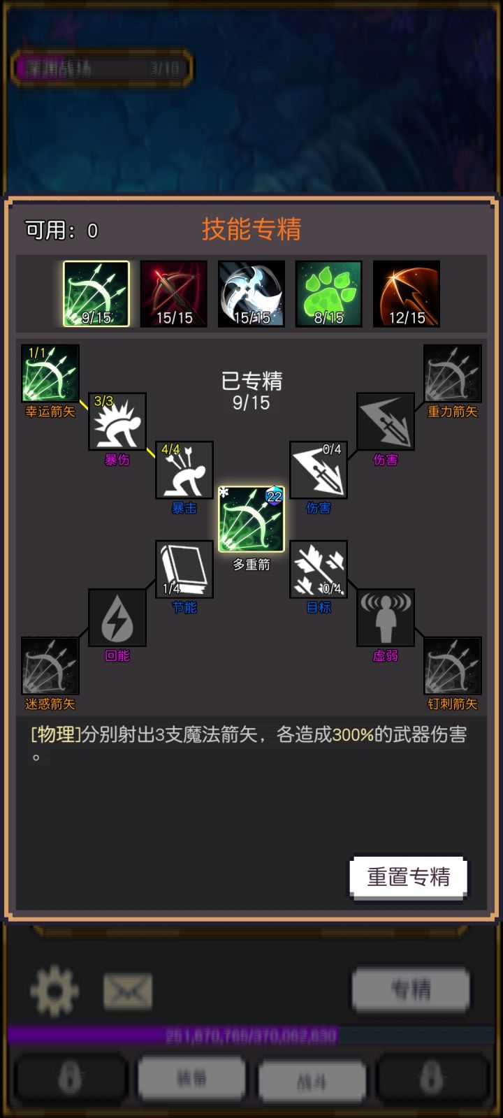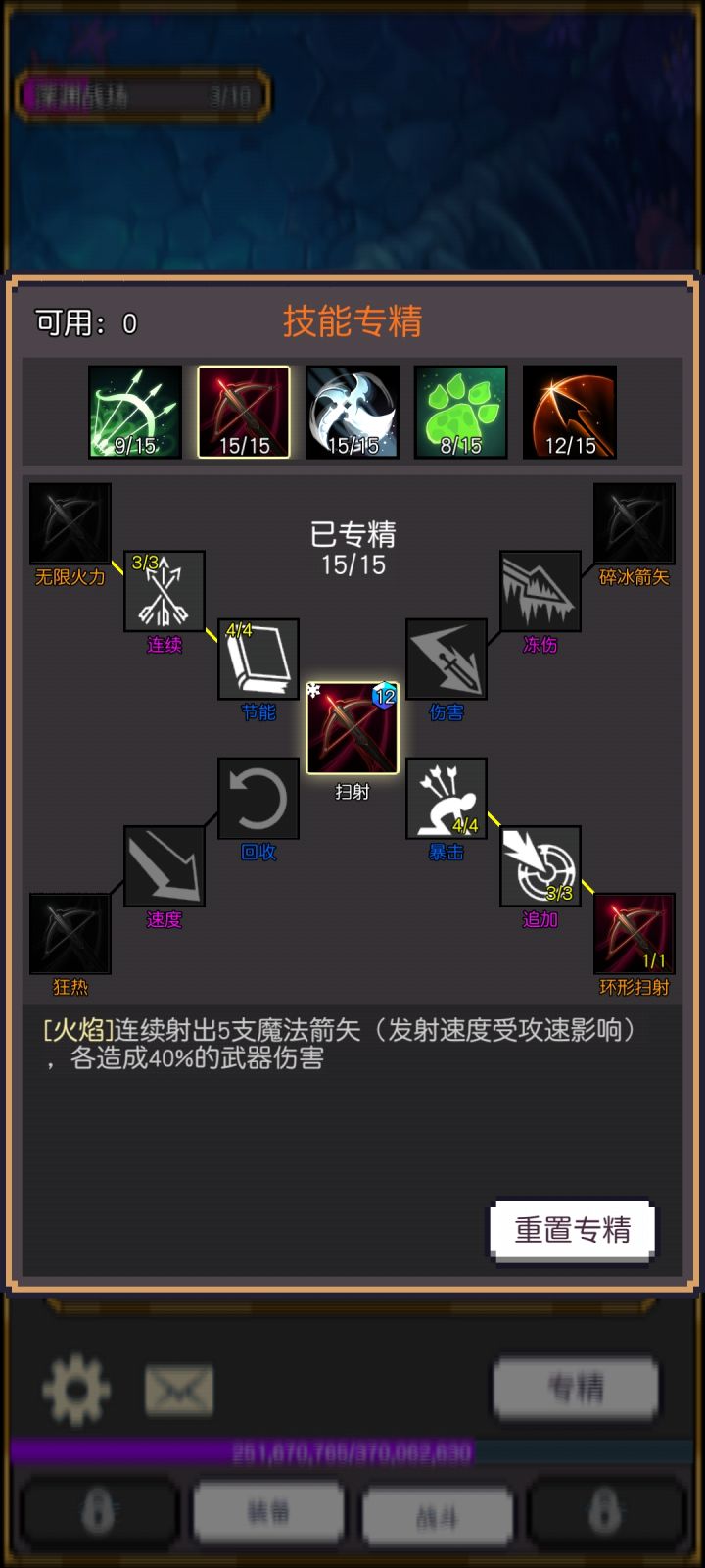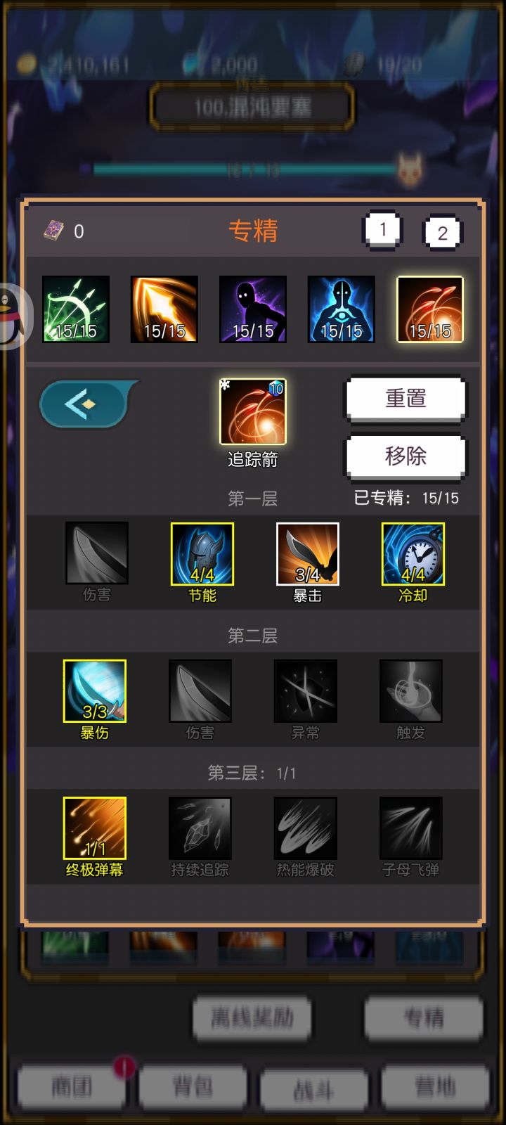 首先通关不会一帆风顺,肯定会卡关!特别是带荆棘的反伤怪,解决办法是(堆血+晕+命中回复)回血 >反伤1、技能选择如图本人尝试多种技能配合,还是如图比较合适前期:扫射+瞄射+标记扫射--刷图用环形扫射,打 boss 用无限火力瞄射-可选暴击/弹射(看刷图打boss 效率程度更换)辅助技能:标记+集中精神(如图配置即可)*多重射击*(重要)刷 boss 和回蓝必备刷图可调整目标和幸