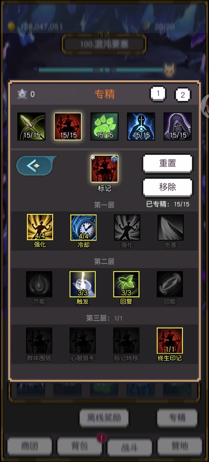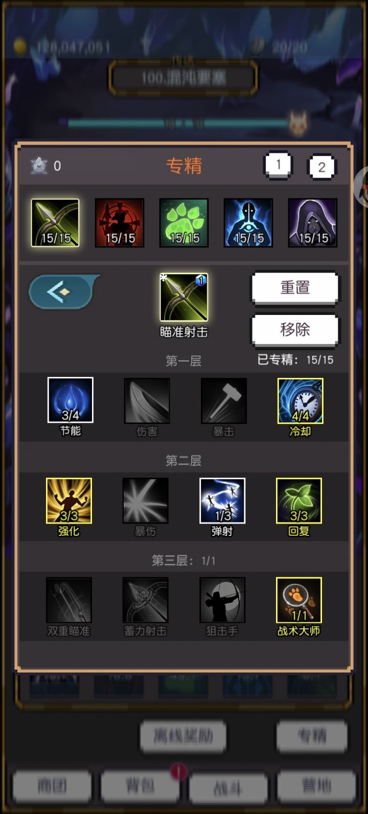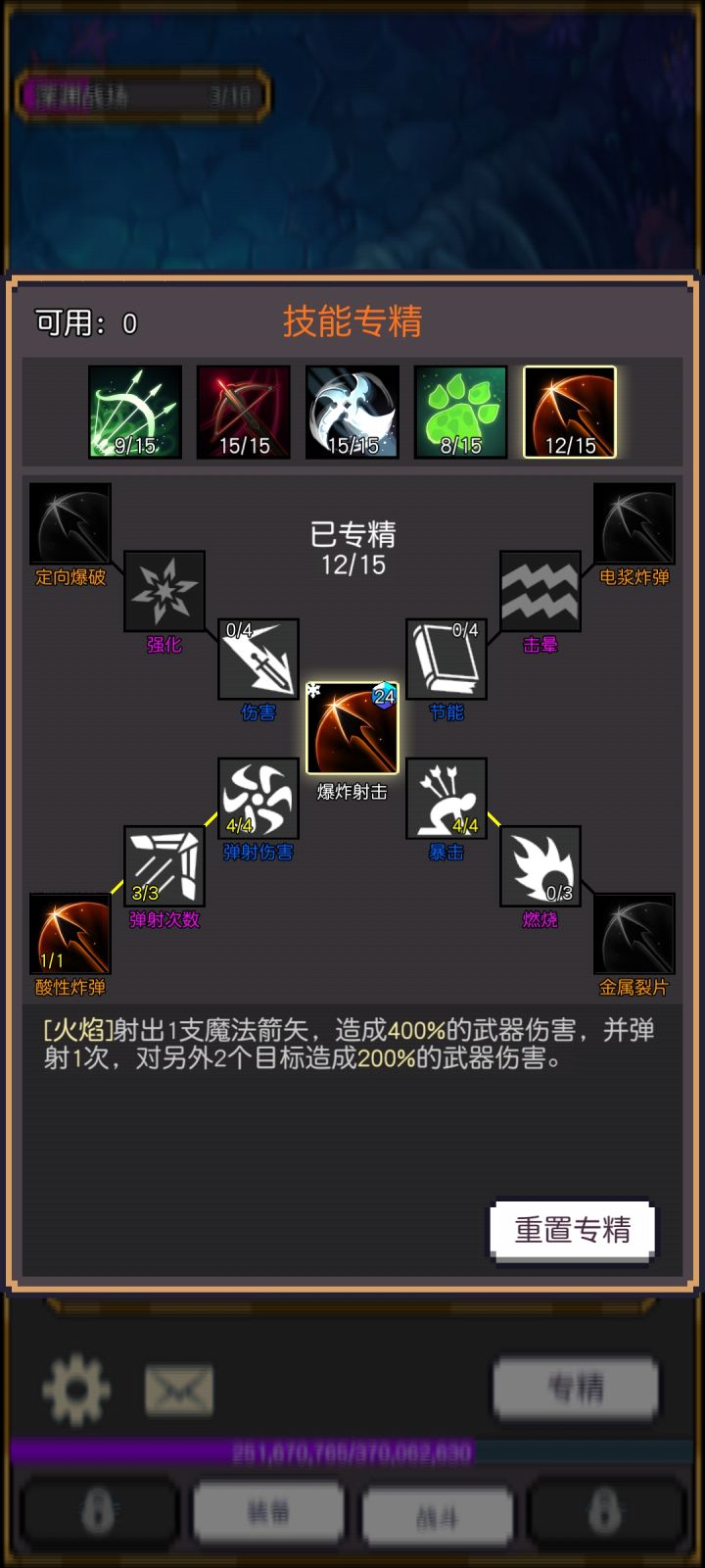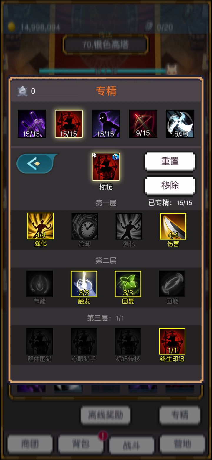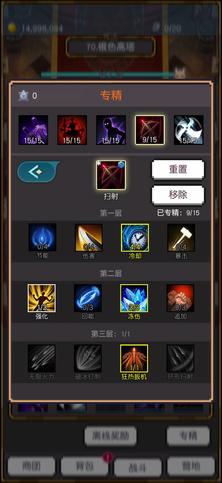 首先通关不会一帆风顺,肯定会卡关!特别是带荆棘的反伤怪,解决办法是(堆血+晕+命中回复)回血 >反伤1、技能选择如图本人尝试多种技能配合,还是如图比较合适前期:扫射+瞄射+标记扫射--刷图用环形扫射,打 boss 用无限火力瞄射-可选暴击/弹射(看刷图打boss 效率程度更换)辅助技能:标记+集中精神(如图配置即可)*多重射击*(重要)刷 boss 和回蓝必备刷图可调整目标和幸