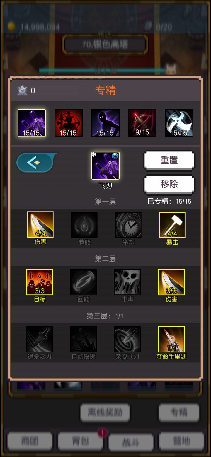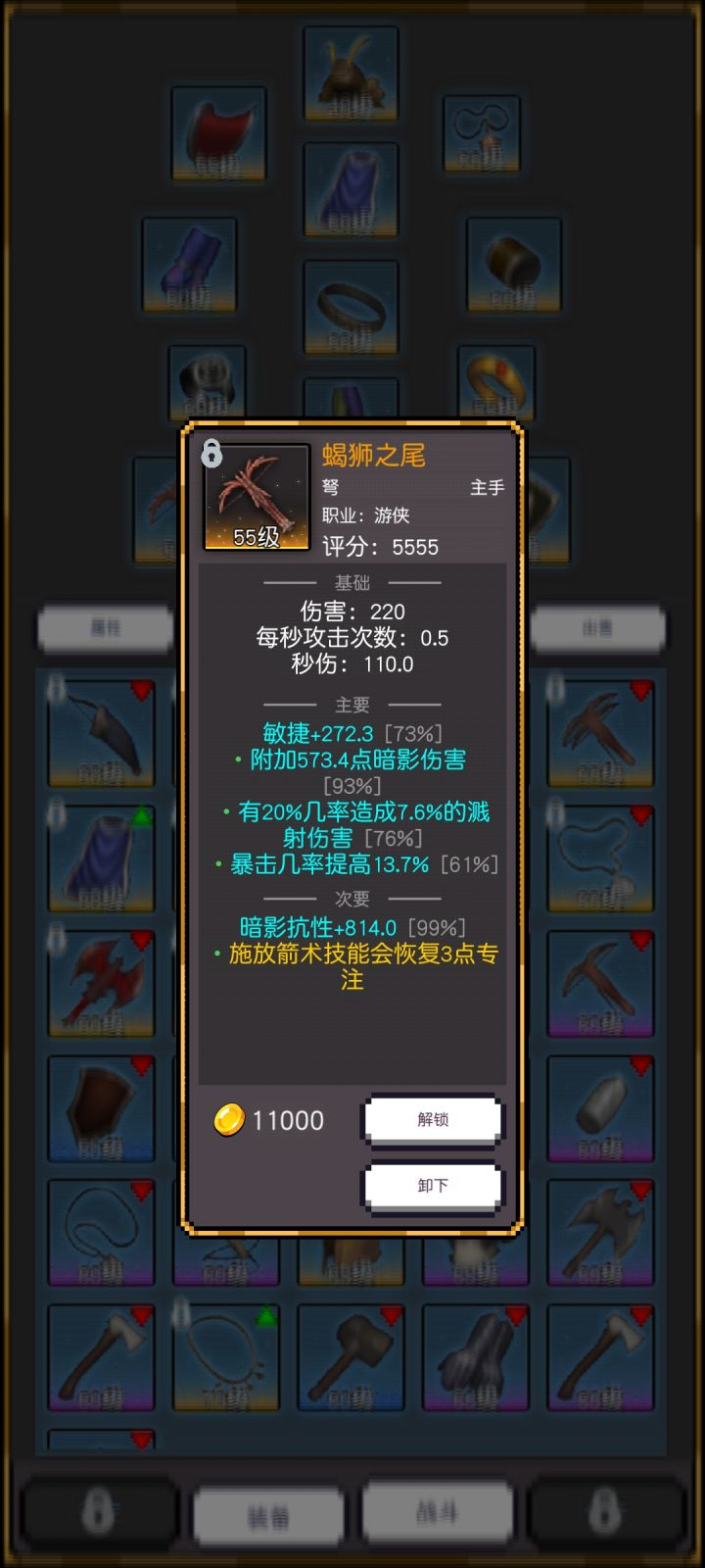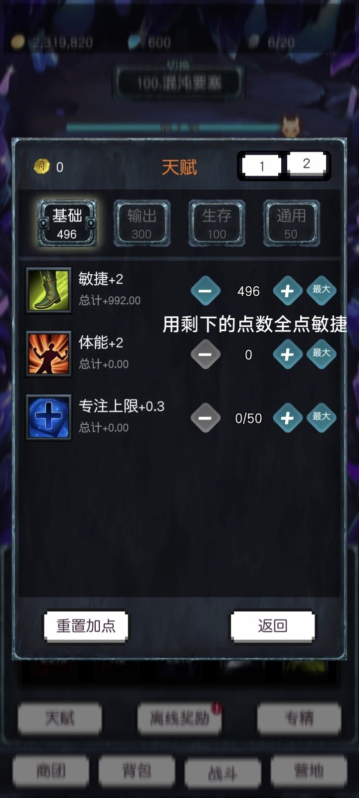 1. 新人前期推荐选用双手大伤武器,不用看秒伤2. 技能是随着等级逐渐解锁的,专精点每通关一层给一个,前期扫射慢慢熬过去,兑换码taptap开箱子凑点装备,优先敏捷体能护甲,击中回复,20级开秘境快速升级同时获得大量金币,开箱子-推图专精-冲秘境3. 差不多解锁橙装换大箱子开,能开出个带眩晕的双手武器可以直奔六十多层(反伤)4. 离线挂机看的是最大秒金,刷秒金到沙子怪层(31/56/81)金