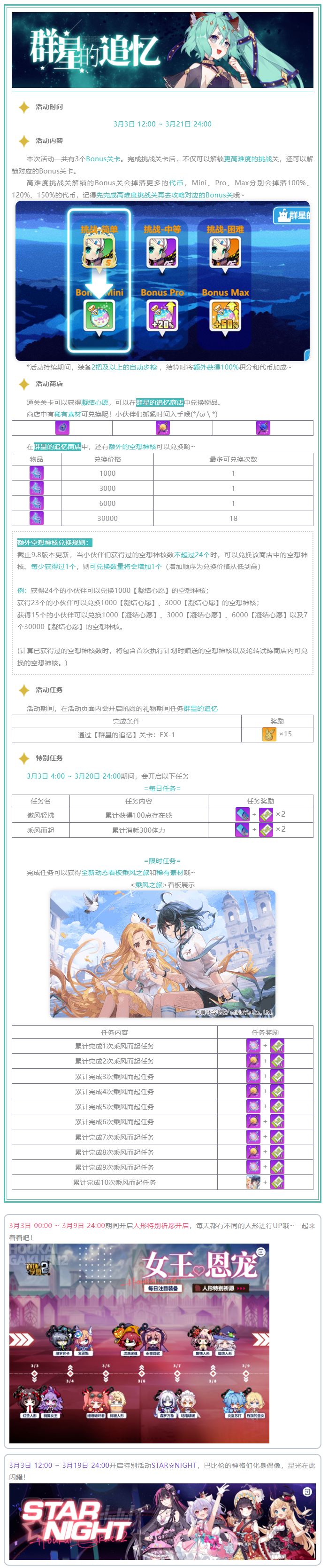 阵营战 签订契约,成为魔法少女吧—— 阵营战选手「齐格弗里德」×「怪异杀手」×「锦鲤」已经准备好了,快来为你喜爱的她应援~ 让我们共同见证魔法之战—— 新春福利 「金珠转转乐」每日欧气检测来了哦! 参与活动十天内必得「自选之星」×10,另外还有“超豪华大奖”等你来试手气哟~ 星灵回路 全新玩法齐登场—— 「星灵回路」主题玩法更新,收集点数、解锁技能,即可在指定关卡获得加成; 在「召回迷魂」的全新