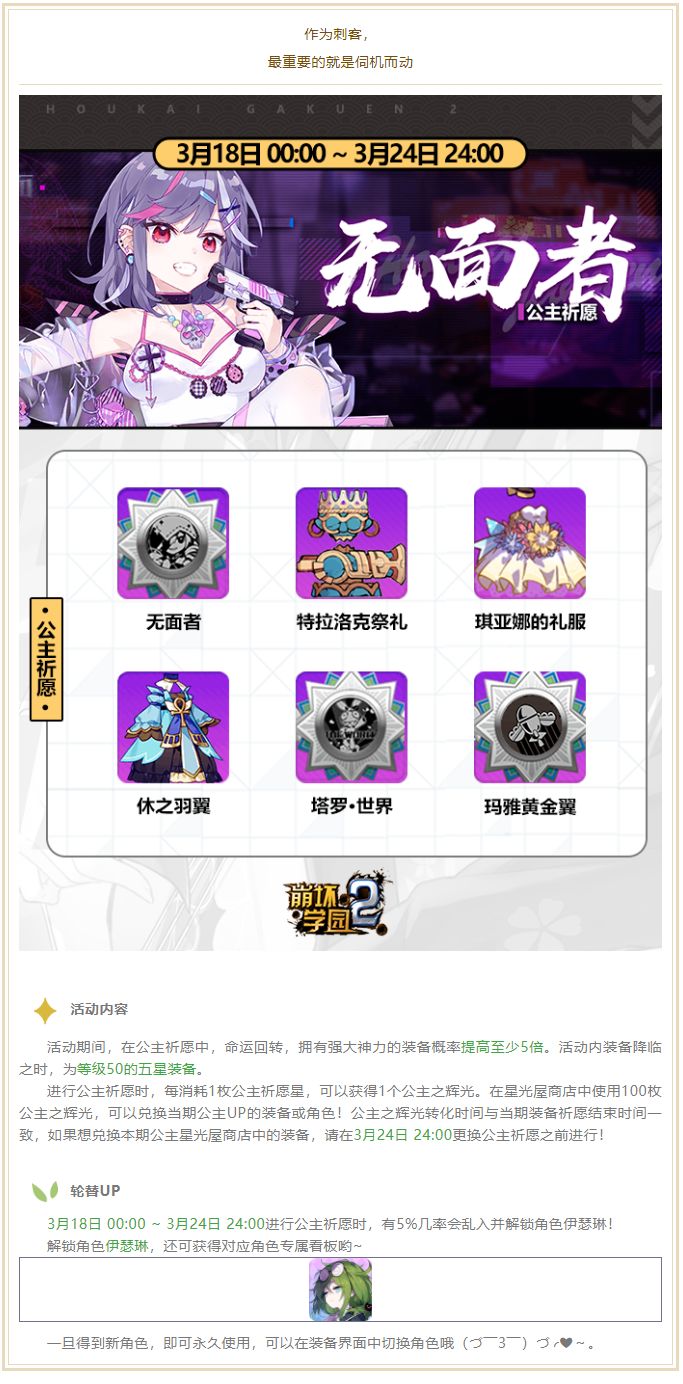 画卷一般美丽的世界,少女便是其中唯一的主角。全新装备「出卷芙蓉」即将开放获取,并获得觉醒的力量。觉醒看板配有全新出场动画哦,快来迎接从画卷中跃然而出的西琳吧~