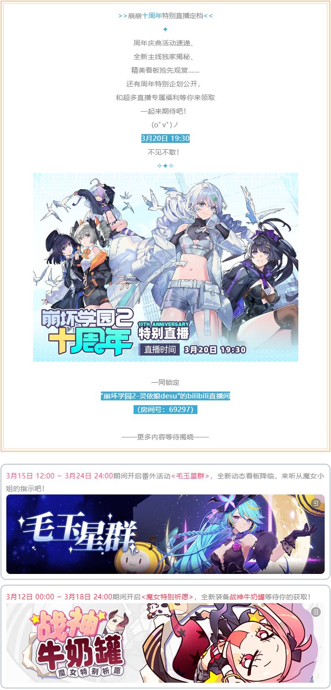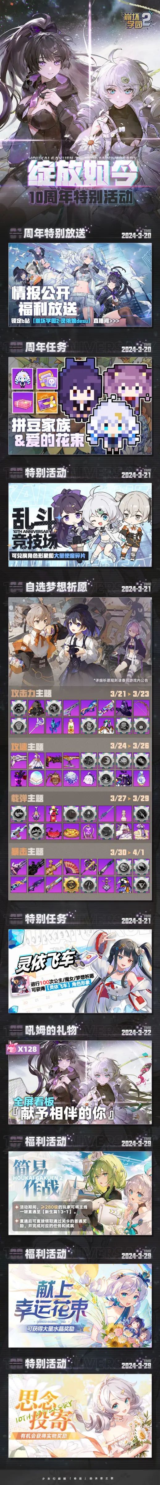 11.0版本<绽放如今>即将上线大家期待的自选梦想祈愿到来这次一定不能错过!还有十周年特别活动开启超多福利等待你的探索更多精彩内容和本小姐一起来看看吧!✦✧✦对了对了3月20日晚上19:30崩崩十周年直播放送快锁定灵依娘的bilibili直播间(房间号:69297)本小姐已经迫不及待啦~