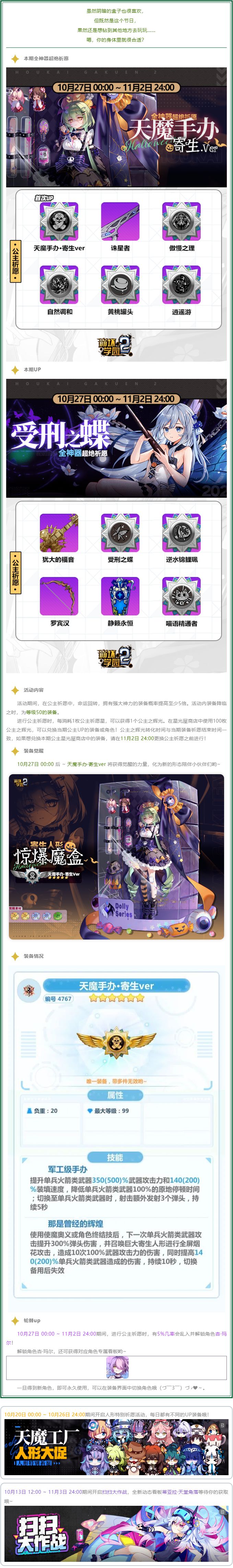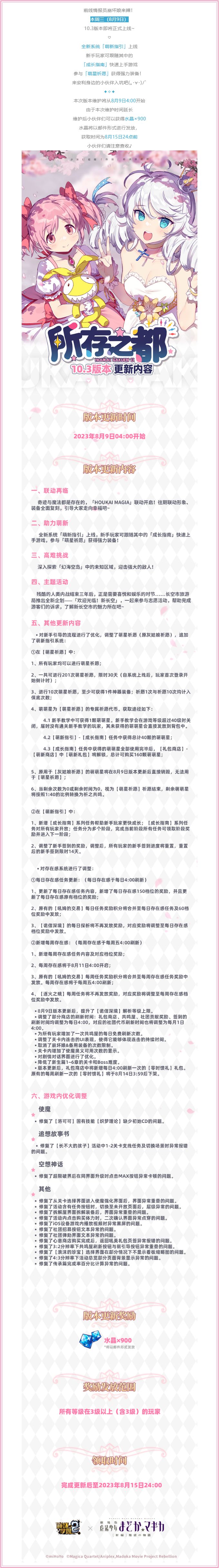 10.3版本「所存之都」即将上线,新版本有这些好玩的哦~【联动再临】奇迹与魔法都是存在的,「HOUKAI MAGIA」联动开启!往期联动形象、装备全面复刻,引导大家走向幸福吧~【助力萌新】全新系统「萌新指引」上线,新手玩家可跟随其中的「成长指南」快速上手游戏,参与「萌星祈愿」获得强力装备! 【高难挑战】深入探索「幻海空岛」中的未知区域,迎击强大的敌人!【主题活动】残酷的人类内战结束三年后,