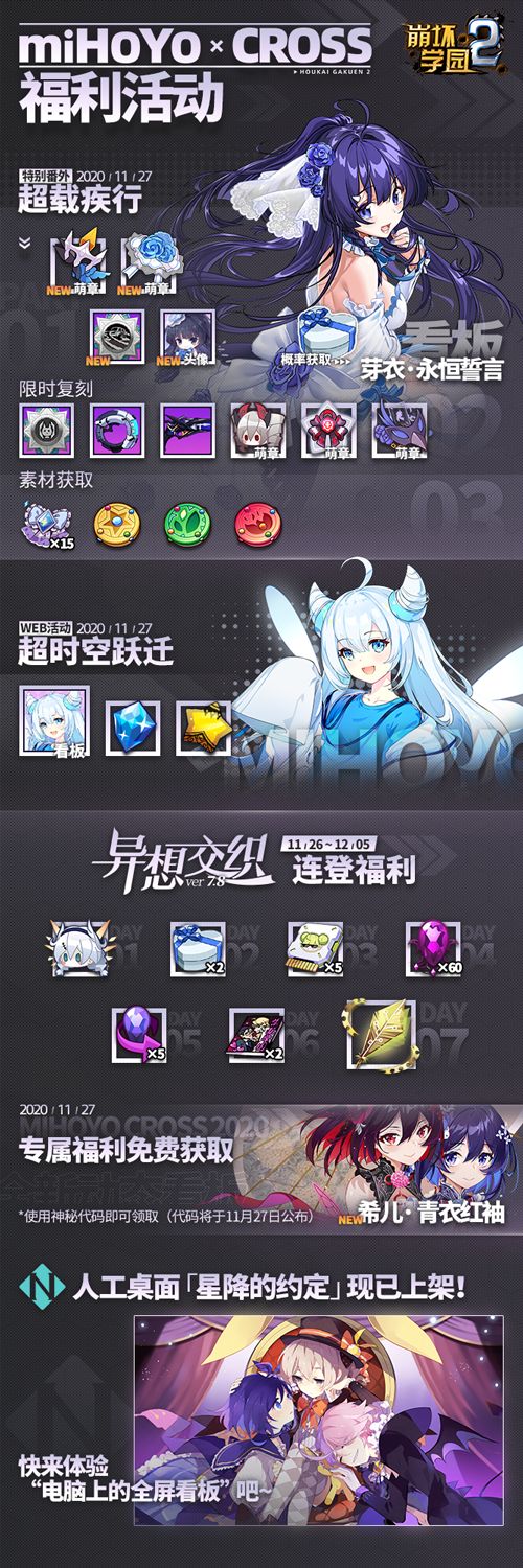 锵锵锵——♪(´▽`)本小姐带着 miHoYo CROSS 最新情报来啦~来看看本次为小伙伴们准备的绝赞福利吧!w(゚Д゚)w「芽衣 · 永恒誓言」「希儿 · 青衣红袖」「米游姬」看板免费获取辣!还有大家一直期待的「芽衣 · 纯净永恒」看板将要闪亮登场!备受好评的「琪亚娜 · 月光骑士」「德丽莎 · 月下初拥」形象也将进行限时复刻~还有还有——在限定魔法少女祈愿「在崩坏的中心呼唤爱」中