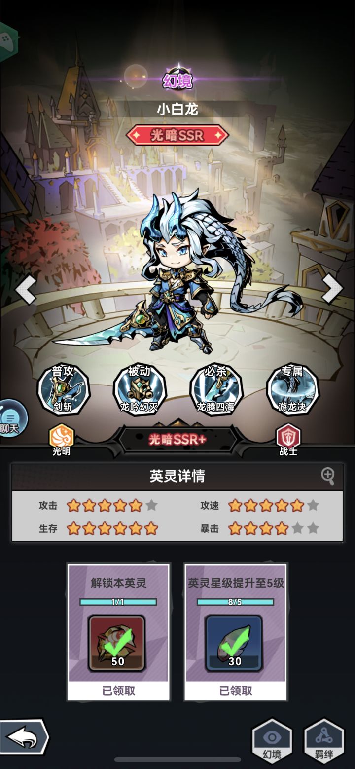 先总结个人对小白龙的评价:t里面最能打的,能打里面最t的。【普通攻击】lv1:利剑斩击对目标敌人造成92%伤害,并每9秒召唤1条游龙环绕(自身3×3范围)飞行,游龙将对触碰到的敌人造成20%攻击力的伤害,至多同时存在3条游龙。lv2:伤害提升至110%。lv3:伤害提升至128%,且游龙每造成20次伤害,为自身恢复120%功击力的生命值。lv4:伤害提升至146%。【被动技能】lv1