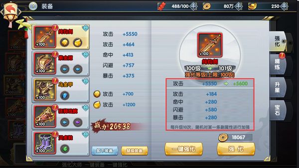 当开启穿戴装备功能后,装备可以随着角色等级的提升,进行相应的强化,获得装备属性的提升,后续章节会陆续开放装备精炼、镶嵌宝石等功能,大幅度提高装备属性。每个角色可以佩戴5件装备,每件装备都对应着5个基础属性。武器(攻击),帽子(法防),衣服(物防),手套(生命),鞋子(速度)。每件极品装备都会有4个附带属性,而且可以出高级属性,命中、暴击、抗暴、闪避。大家可以根据角色需求不同,选择不同的装备佩戴,
