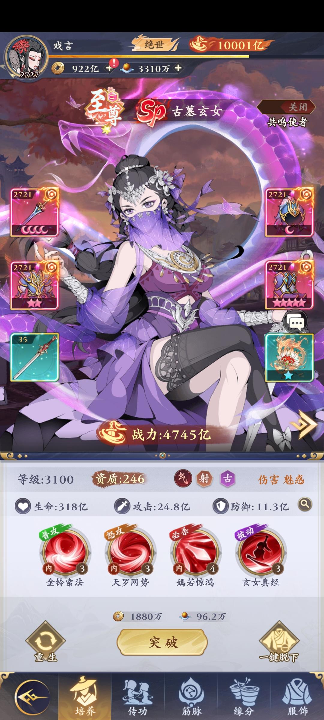 平民党级别,氪金54¥(新手礼包6*6+18情花)过年送的68¥玉币,庆典补了3个18这游戏主要玩法和资源产出:PVE:主线/闯关江湖/聚贤庄PVP:问鼎(每周换东西有数量限制,前20名低保能换完)主线推进离线是固定关数,68¥特权离线+100%在线没一套装备提供高闪避,输出基本上会被一直控制到死,而且主线没有珍兽回能量,要效率只上3张卡,1辅助+2输出,推荐3套阵容过渡段誉+郭小侠+