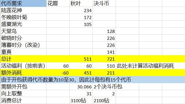 更新: 之前表里是按每个包开15代币算的。 是我高估了ch的良心... 如果开10个代币,那么如果要兑换全部红叶套(即陆莲花、银叶菊、盛夏湖光),需要开511/10=51.1=52(向上取整)个包,即减去活动4个包,需要购买48个包,计4800钻。 如果再买两个决斗币包,则计6900钻。 emm非洲同胞们,大家自己考虑一下吧... ————————咯咯哒——————— 看到微博的活动内容后,瞎搞的