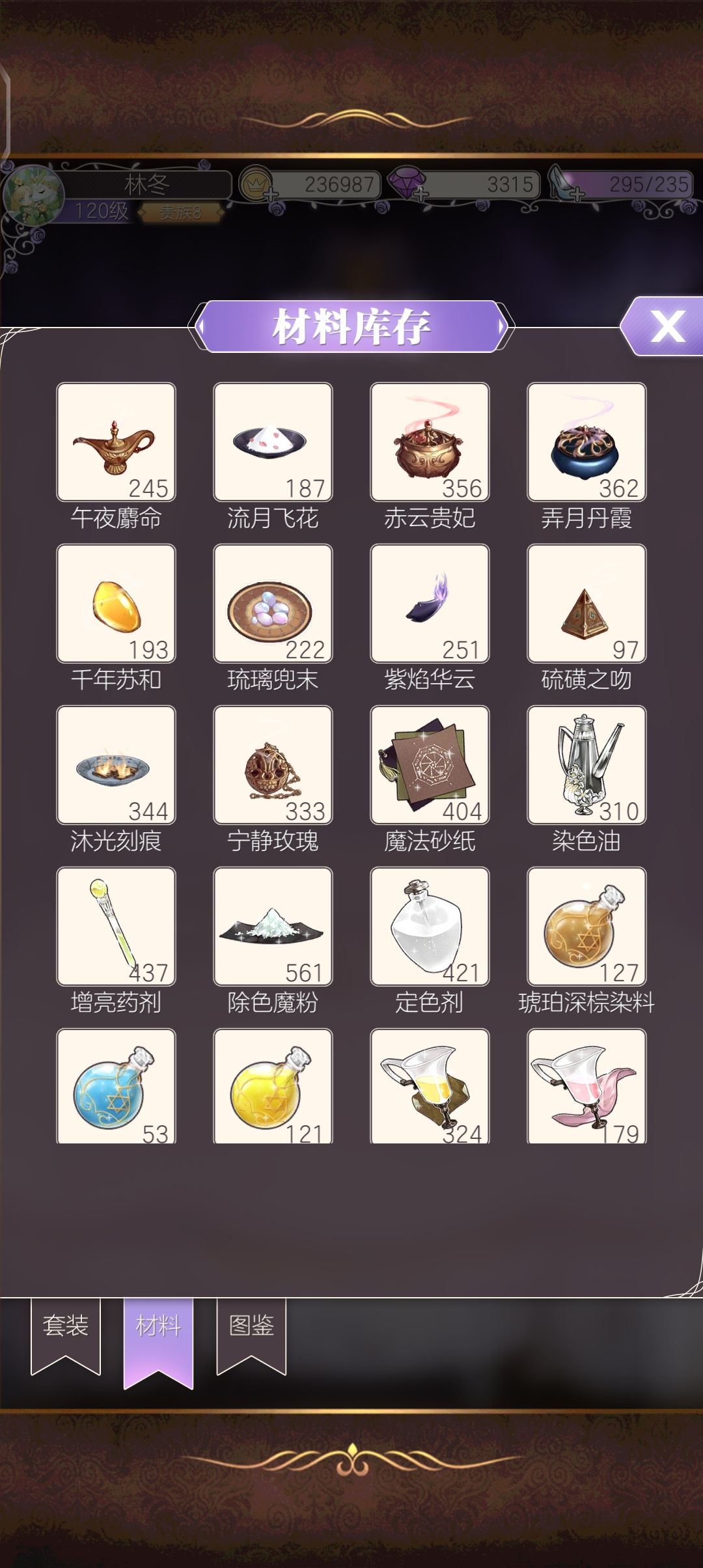 a.暗夜之舞-火灾 b.宝石迷踪-彩虹钻石 冰雪祭典-种树 c.传文生灵-古伦陷阱里 传世生灵-阿伦秘制肉 茶话会-被贵族嘲笑 传世之所-雷斯林 传世之所-讨薪钟声 h.幻兽之旅-管狐 幻兽之旅-驯服三头犬佐伊 花之女神-金百合 环球剧场-作者蒂拉 环球剧场-勇者永生沐浴龙血 j.机械时代-黑影 l.朗月庆典-花束 m.命运之旅前篇-恋人 命运之旅后篇-书记官 妙笔诗篇-裘洛洛 马戏团之夜-包子馅