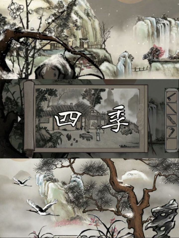 很少有人在提到中式解谜时会想到《四季》。这个游戏其实和《梦蝶》差不多是同时期的游戏(18/19 年),也具有类似的水墨画风(不过玩法不同)。-《四季》是一个点击式解谜游戏,解谜整体不难,场景以水墨画轴式展开,内容取材于《诗经》,春去秋来岁月斗转,一人独守待良人归来。虽然存在缺乏引导和剧情单薄这类问题,但它依然提供了一种关于中式解谜的可能性。-当然魂动的解谜游戏玩起来总能感觉得到,即使画风自