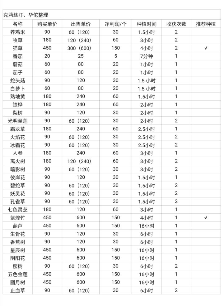 萌新看过来~是不是不知道种啥比较赚钱?又或者种啥比较划算?这里整理了一下全部的种植植物和售价以及净利润。推荐打勾的这两个一起种,把每天的种子定额分三份。一份猫草,一份竹子,一份其他需要的作物。竹子保证有钱买种子,猫草保证有持续收入(虽然也没多大差别),其他作物保证菜谱制作(回血回灵魂值利器)。当然,前期没解锁竹子的话分两份就行了。