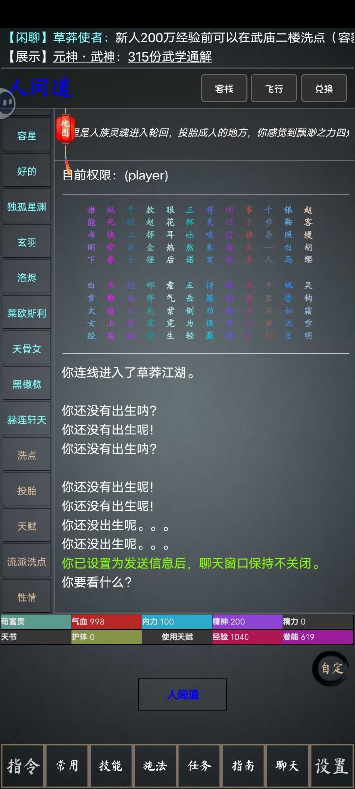 新手开局教程保姆级教学,帮助有兴趣玩mud的朋友入门这个相对难入门但非常有意思的武侠世界。对应游戏内容和攻略内容依次行进即可本服转世会自动出师,保留上一门派所有武功,每转需要在不同门派转世,(使用五绝令,狮王令,光明令)会直接出师首先,推荐出师顺序为太极,少林,全真,雪山,仙武门派,神龙,华山1:进入游戏取名字,性格多变,天赋不用刷,悟性流,世家随意2:出生后右上角签到点一下,兑换里面,