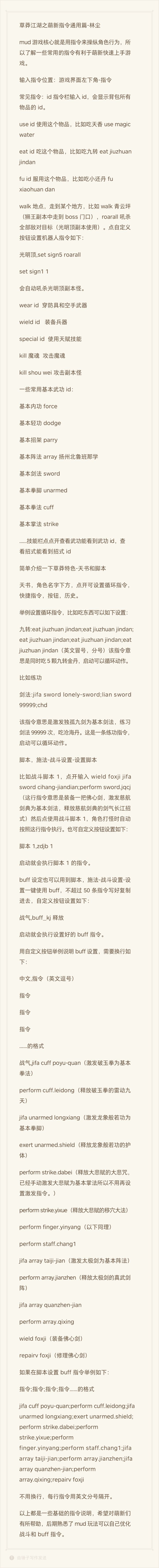 草莽江湖之萌新指令通用篇-林尘mud游戏核心就是用指令来操纵角色行为,所以了解一些常用的指令有利于萌新快速上手游戏。输入指令位置:游戏界面左下角-指令常见指令:id 指令栏输入id,会显示背包所有物品的id。use id 使用这个物品,比如吃天香use magic watereat id 吃这个物品,比如吃九转eat jiuzhuan jindanfu id 服用这个物品,比如吃小还丹