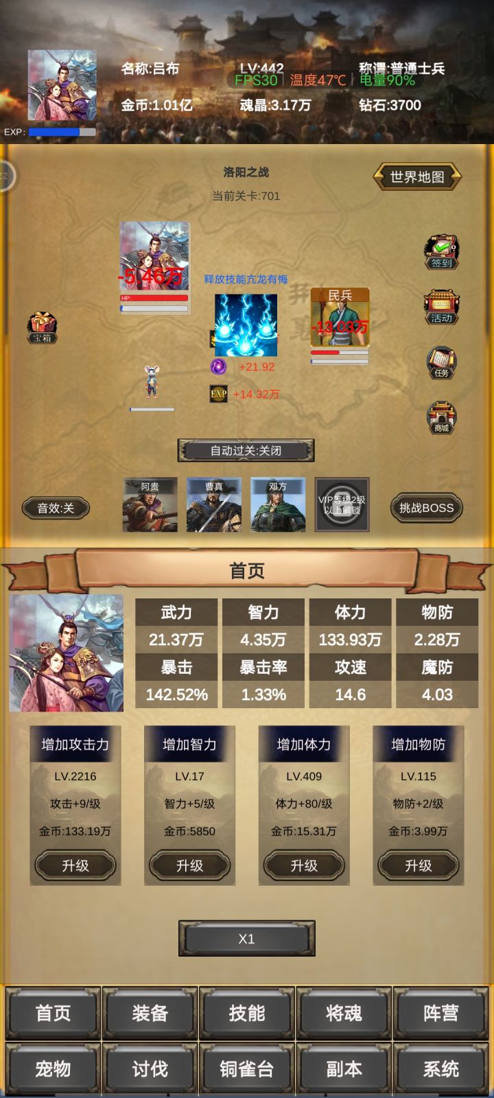 这个游戏主要玩法就几个将魂,佳丽,装备都是给加成的其中,装备在你低品质装备升到十级左右,你就可以存20个合成下一品质的毕竟在升级低品质的就不太划算。接着就是这个游戏的属性。前期主要升武力值和体力,打到中期就要高拉智力了因为后期怪的闪避特别高所以在后期智力也很重要。然后就是将魂,将魂这个挺重要的。后期将魂给的攻速和爆率很离谱,主要的暴击伤害跟爆率都是将魂给的将魂还能带来很高的各属性增幅。铜雀