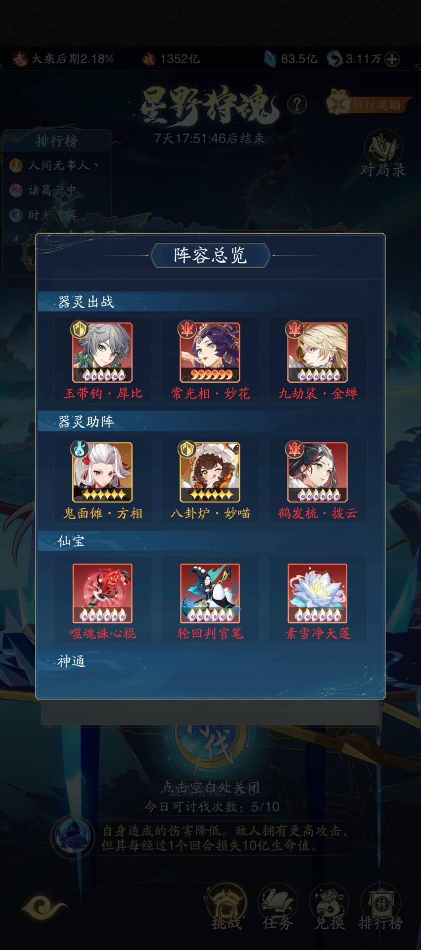 2025.07.07日更新:目前常识最高伤害4698e,阵容在图5,伤害波动在2000e-4698e之间(怪物老闪避少了攻击回合)刷新令牌不够用,发现用玉儿性价比还要高一些,感觉最少还有1000e的提升空间。----—----—-----历史分割线----------------本人33e战力,本区第一34e战力打了5200e伤害,主要是要注意自带的主器灵,如果主练牺尊就难了,因为自带器