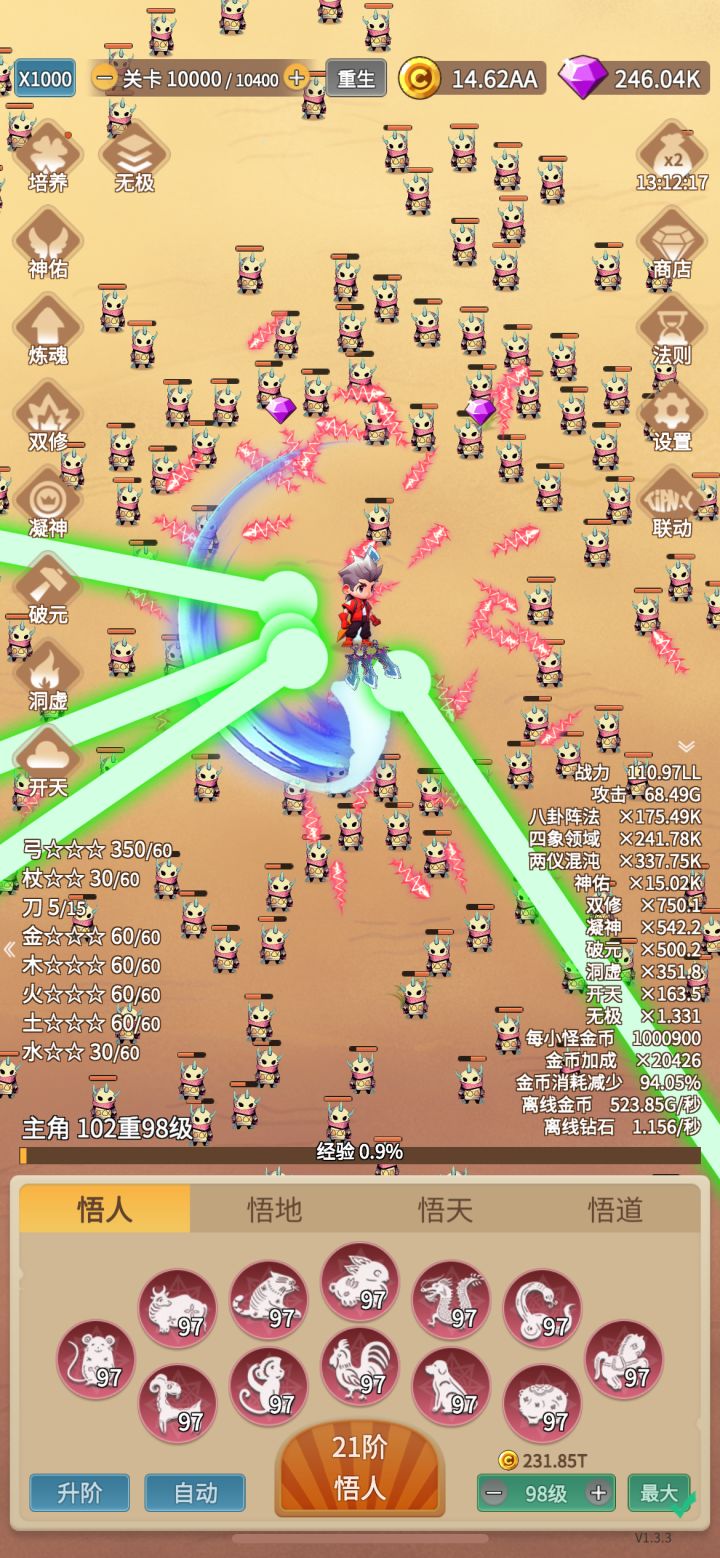 前期的时候比较无聊就只能看完广告把那一点点的加成点上,不过当你第一次重生以后游戏的内容才慢慢展开来,从武器和五行的搭配,到解锁了的天地八卦阴阳太极,有一种玩类养成的感觉。