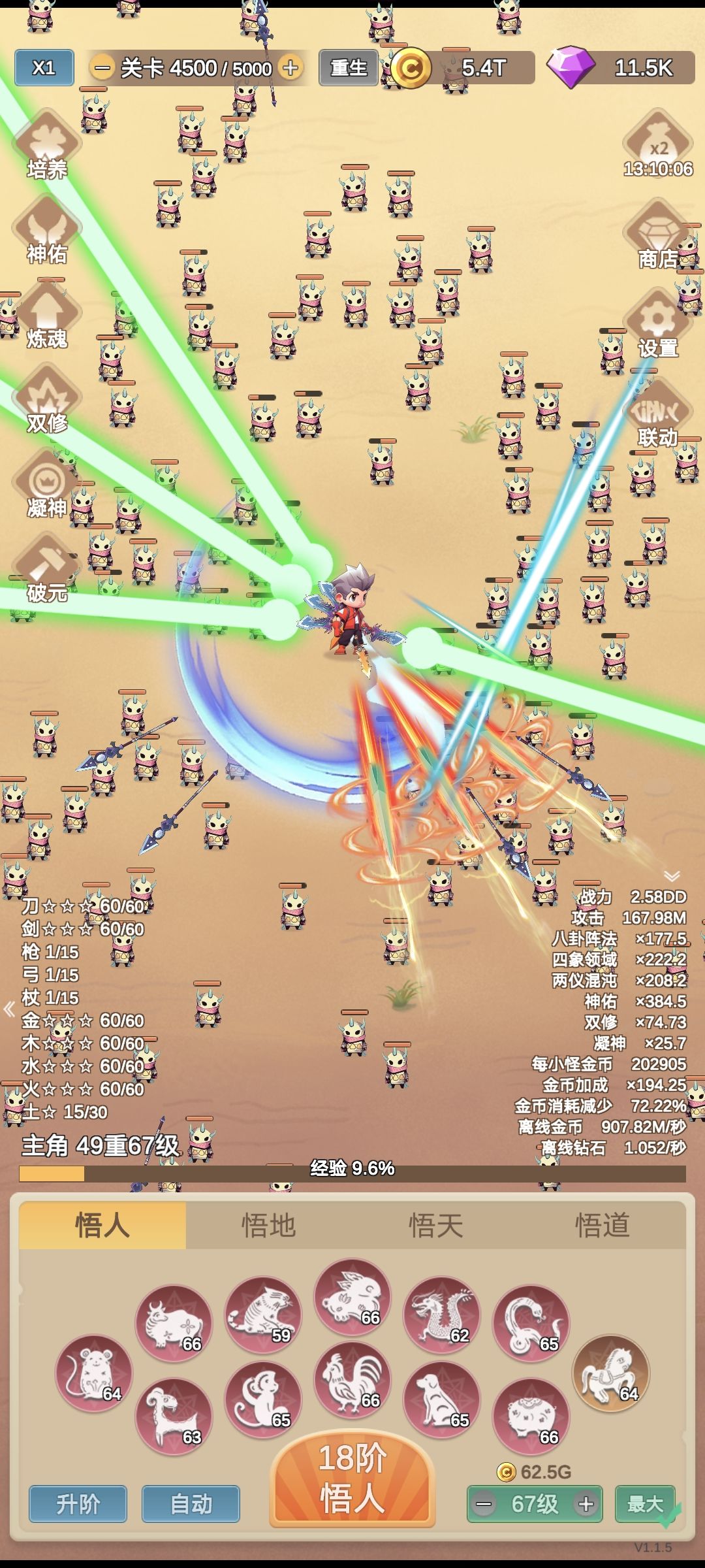 (注:一般说的第X重,就是指左下方显示的重数) (补充一句:每过100关,boss的血量就乘3) 目标,第一次重生,100关,冲! [表情_+1] 过关思路:攻击力!攻击力! 武器,任意一个超过15级就行;五行,15水>15土>15金,三选一有一个效果就行,剩下的交给攻击力。如图,大约4000多攻击就行了。 ————分割线———— 重生1次后,获得5点炼魂,用于自由加点。 注意:先换装备,再用炼