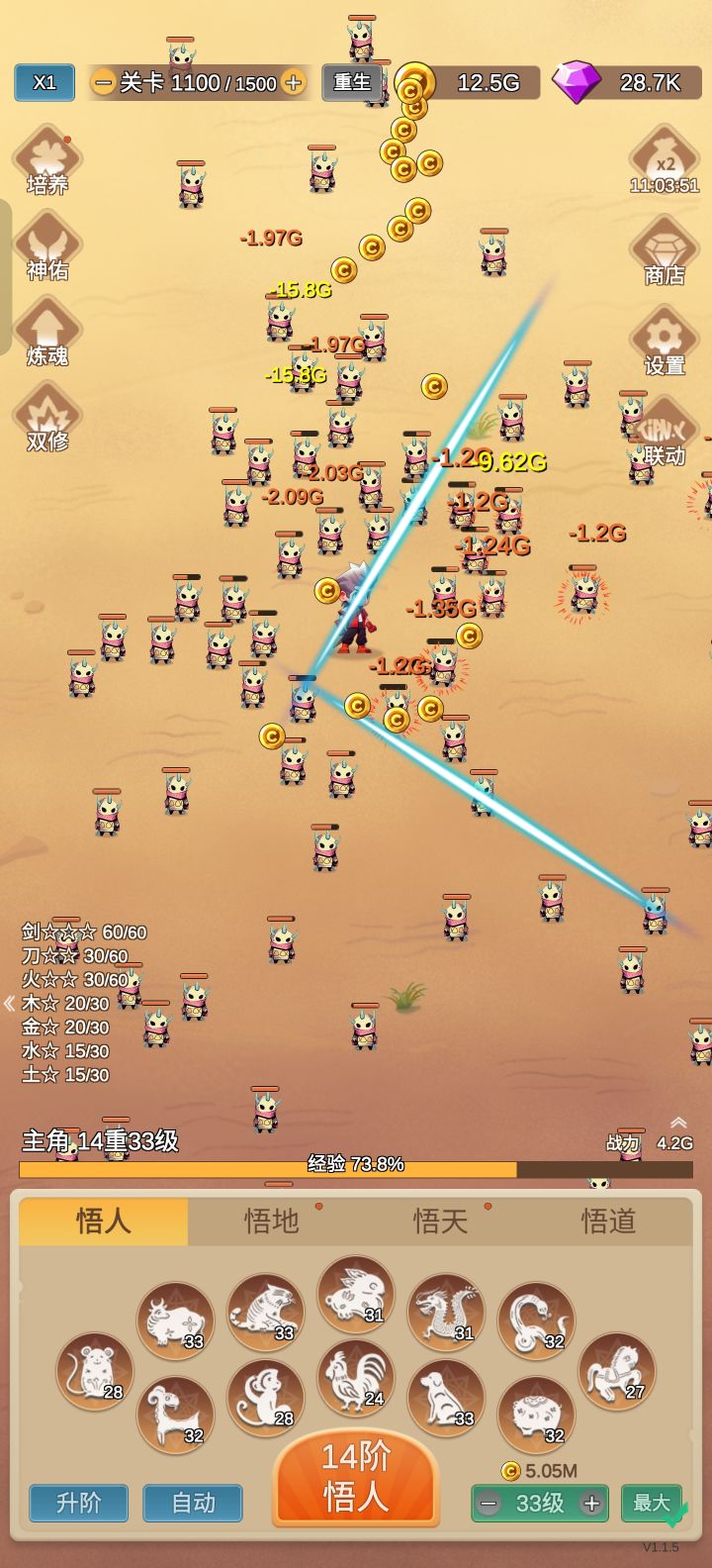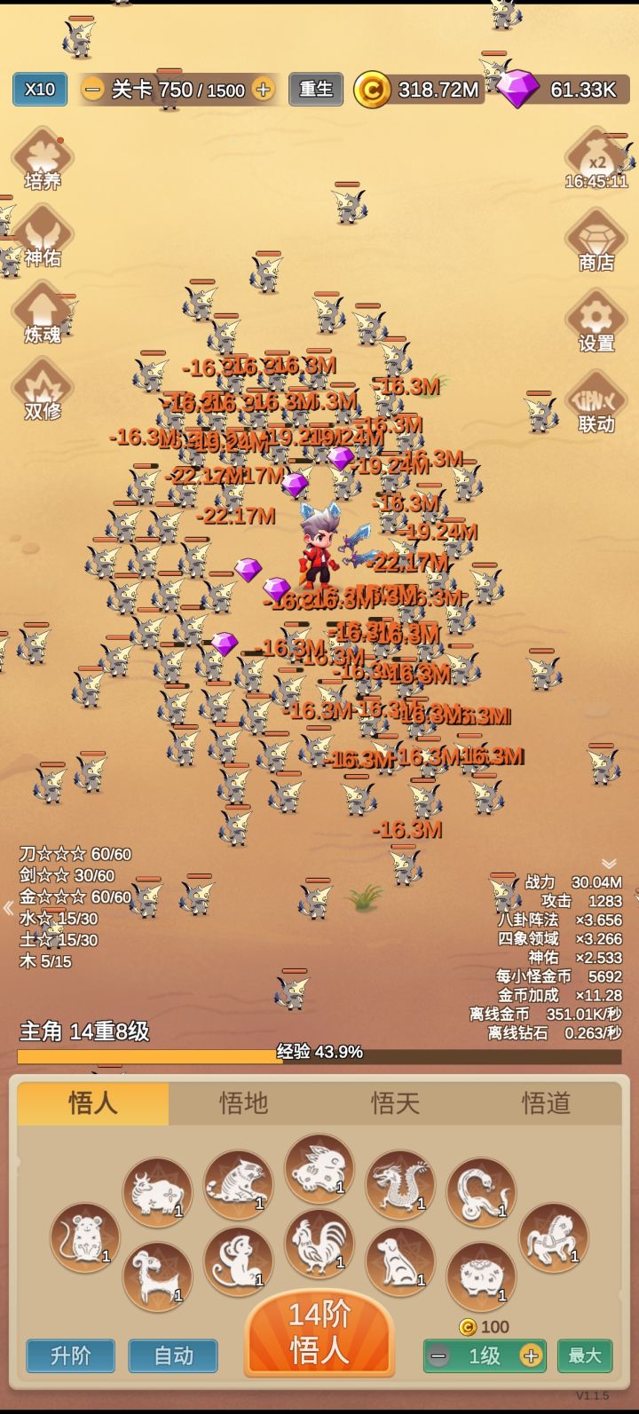 新版本五十重前,武器优先剑,五行优先木→火→土→水,期间如果能把刀升到30,可以带上刀,一是因为单武器没有开破元前叠加层数超60收益低,二是因为双武器悟人更容易碰到合适的。五十重以后的思路是先单武器配合五行,因为破元在武器60以后可以提升武器额外伤害,单武器最多可以叠加到132,预计57重时双武器和五行可以毕业。双武器毕业后,升级的收益会降低,后续版本可以会加强炼魂对五行及金币收益影响