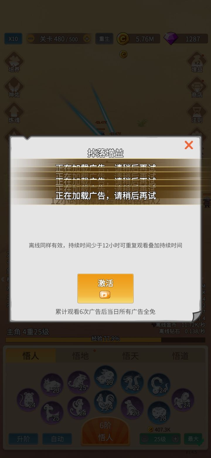 这游戏一天加上离线双倍广告差不多30个左右,不算肝,包括很多时候不需要全天登着,基本弄完划掉过俩小时上线看个广告左下悟人配置一下需要的武器直接10倍速,跑完稍微配置一下炼魂里面的金木水火土属性之后大最后一层boss,打不过就划掉继续挂机。那些属性怎么搭配怎么搭配的有很多攻略都有了这边作为一个萌新就不谈了,我来说说作为一个新手游玩者自认为刚开始玩的时候没马上点出来很后悔的事。1,看广告5次之后,右