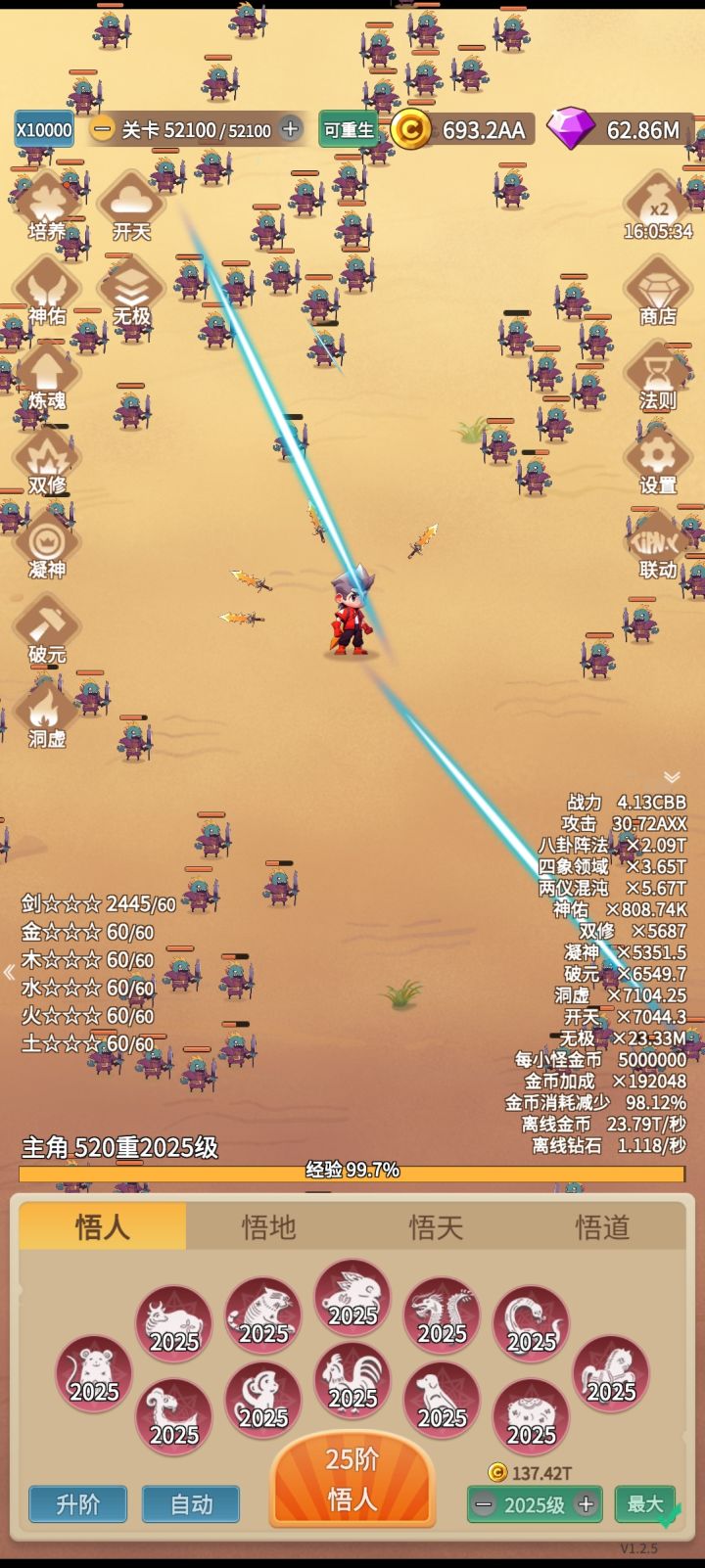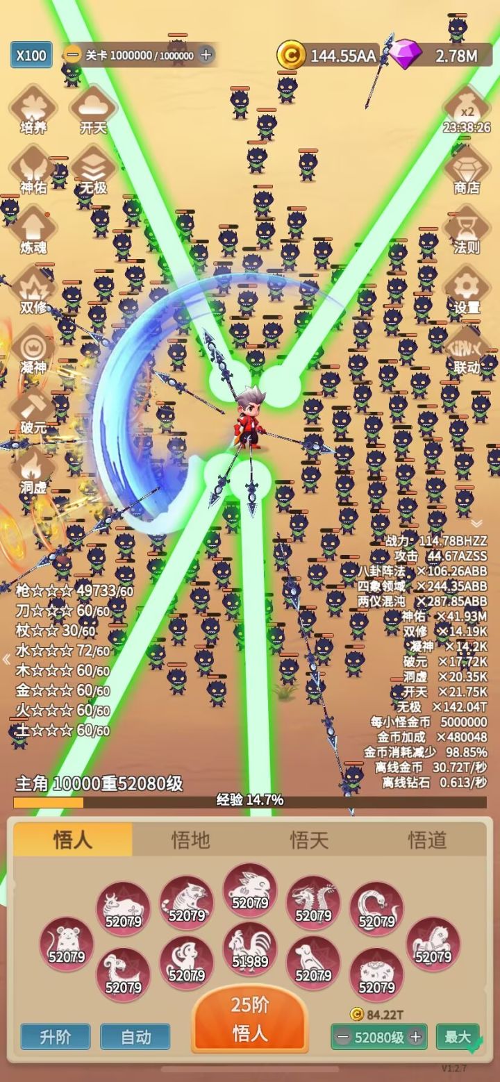 玩了有5天了,游戏整体来说还不错,不用花太多时间在线,基本成型以后就每天上3-4次收收菜,升升生肖之类的就行了,反正这个游戏最重要的资源是砖石,每天看广告获得的砖石增长都是一样的,最多也就晚个1-2天的进度,砖石前期把悟人点到15-16这样每天就主点神佑和培养。目前版本来说应该刀剑是当前版本最好用的(主剑,刀有30就好),清兵清boss都快,挂机效率杠杠的,当然需要搭配60木30土,点数够的再点