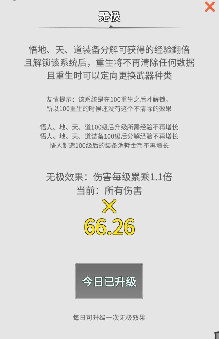 为方便描述,本篇会使用很多的指数和对数先解释一下,游戏过了100重以后,解锁的新系统——无极总结一下:1,悟天、地、道(以下统称“三悟”)经验翻倍;2,三悟等级超过100级以后,每级需要的经验和100级相同,不再逐级递增;3,100重以后,重生时,悟人装备不再重置4,重生时,可以选择悟人装备的某种武器,将其无损转换为另一种武器(因为装备不重置,所以如果想要换种武器玩,除了换装备,还能使