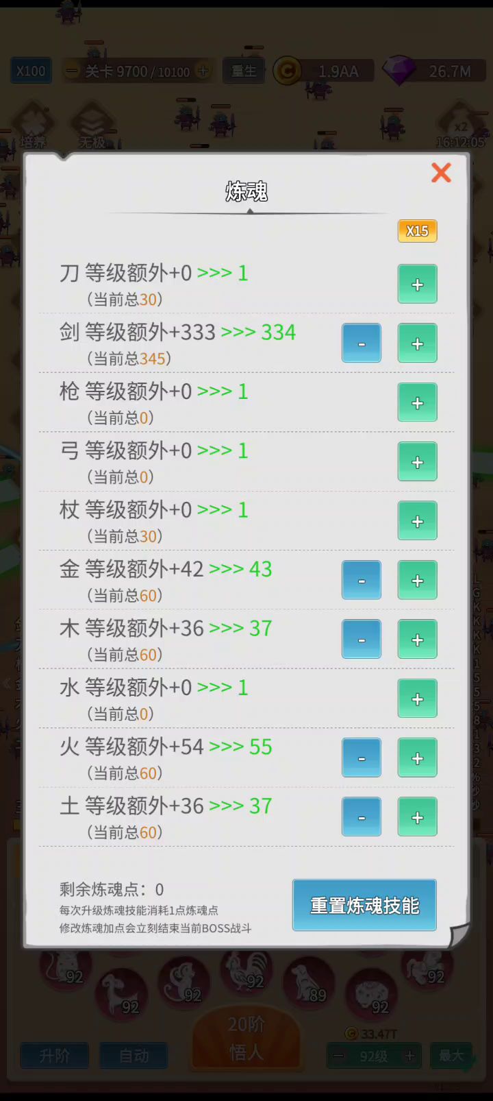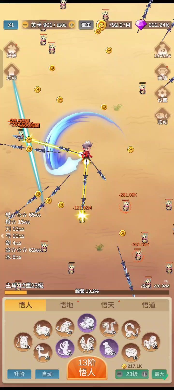 1.第一步先看六个广告,把钻石还有双倍增益领了。 2.用钻石把悟人升到11阶,神佑20次,培养把小怪每秒生成速度点到6、小怪上限点到35、金币加成点到40%。 3.手动点击悟人将等级升至3级。 4.将关卡调整至50并点击右下方最大按钮将装备等级调整至2级。 5.将自动悟人设置成:不勾选攻击提升、期望品质白色及以上、刀剑枪杖金木火分解、弓水土0、可接受降低值2、自动倍速10。 6.开始自动!不用管战