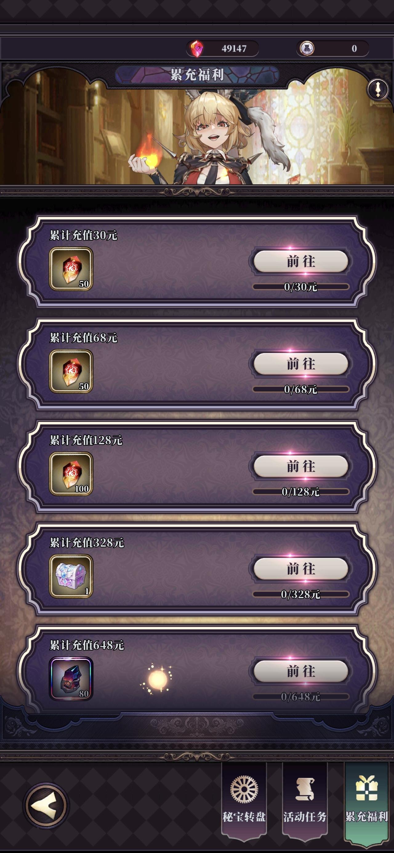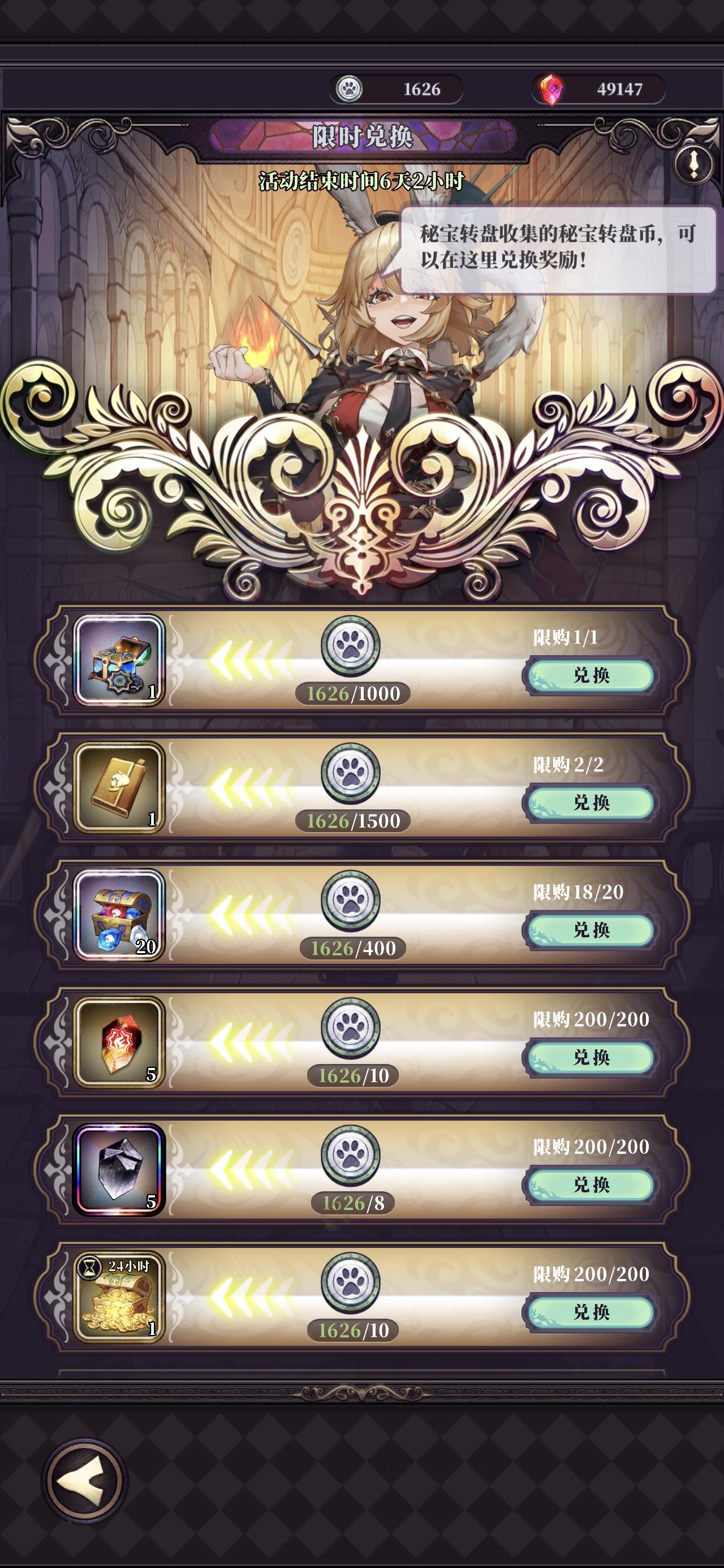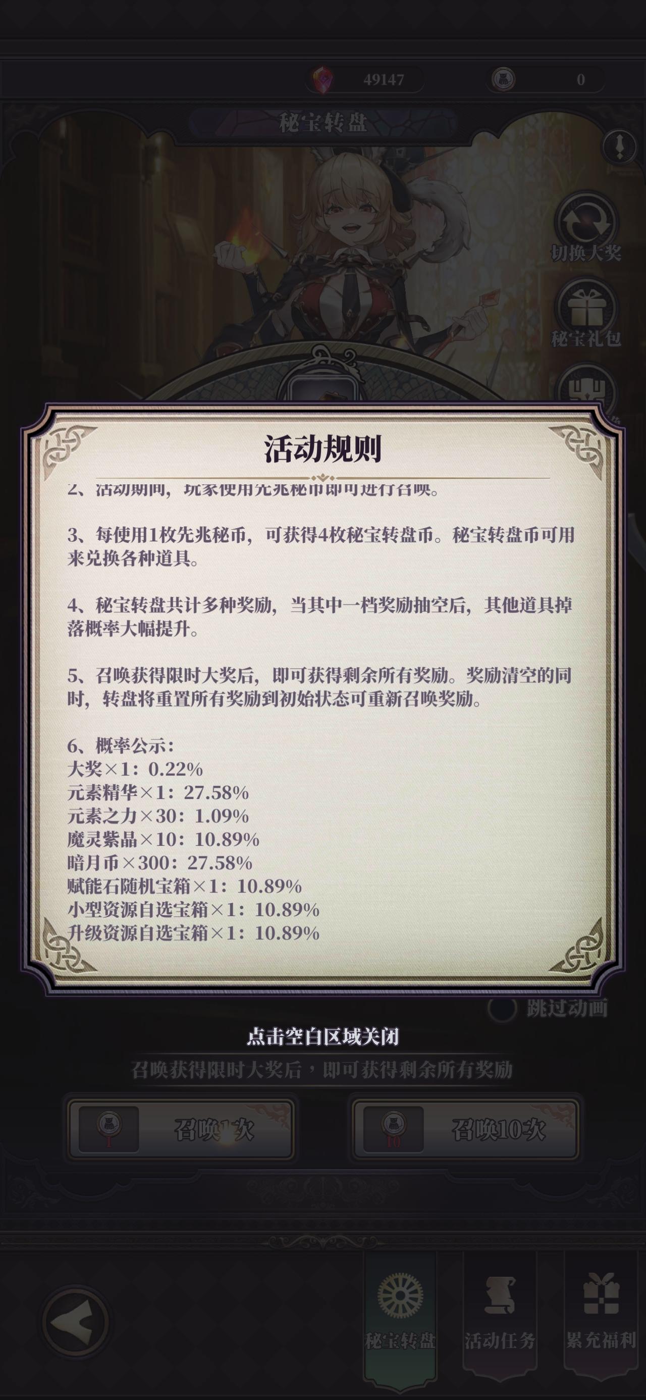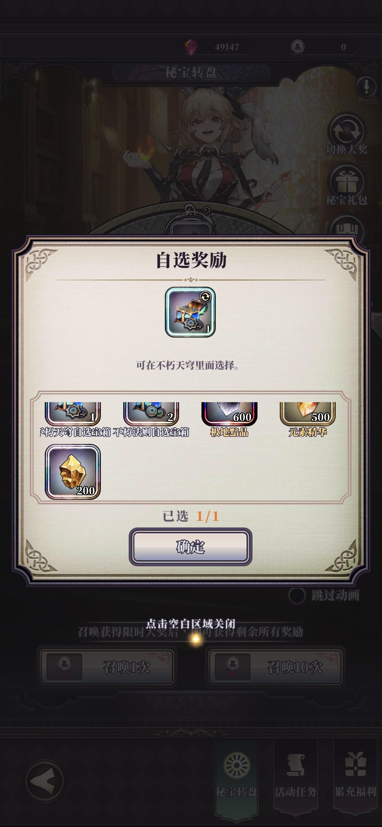 累计先兆秘币*200再去抽取1. 累充奖励:328档位最值2. 秘宝兑换优先级:不朽天穹自选箱*1>=命格自选箱*400>元素精华*1000>=极地黯晶*1000>其他1000转盘币=不朽自选天穹1个=命格自选箱*50=元素精华*500=极地黯晶*6252. 价值计算:(1)集市获取命格自选箱*50,需1280/3*5=2133金钻元素精华*500,需980/3*5=1633金钻自