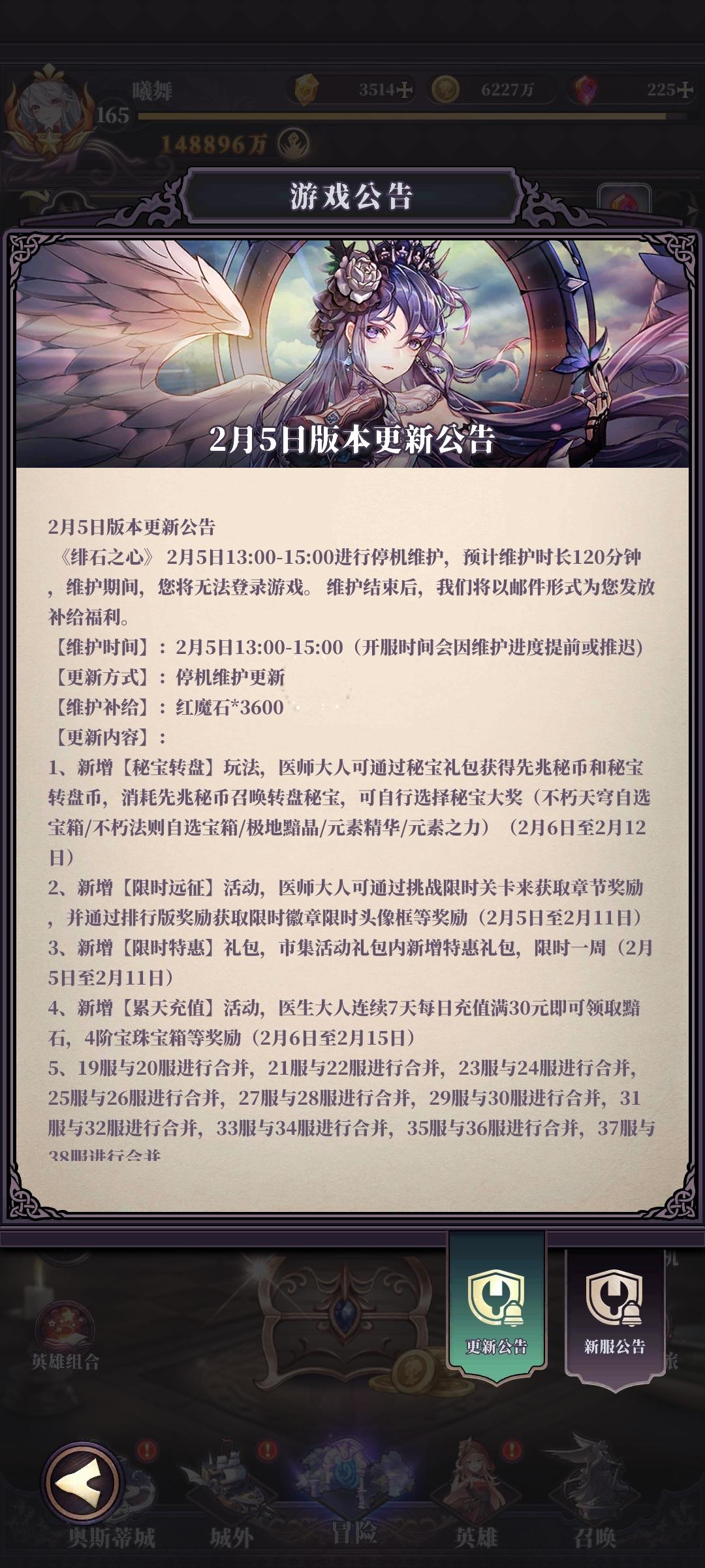 ---【2月5日版本更新拆解|这次更新在“喂谁”、在“榨谁”?】2月5日《绯石之心》的更新,看起来内容很多,但如果按“资源流向”和“行为引导”来拆,其实逻辑非常清晰。一、表面福利,实为启动资金 停服补给红魔石*3600,本质只是“登录恢复成本”,刚好覆盖一次常规消耗,目的不是让你变强,而是确保你有资格参与后续活动循环。二、核心更新只有一个:付费转化器 【秘宝转盘】是本次真正的核心。关键词