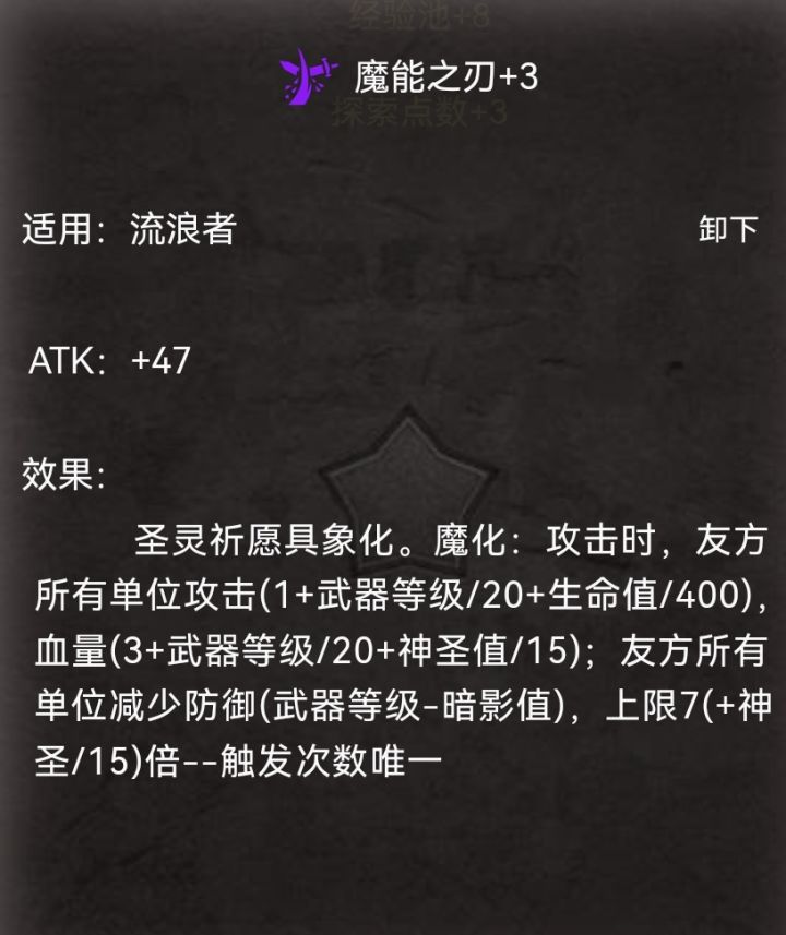 我的魔能之刃等级为3,流浪者生命为348,因此加“1+3/20+348/400=2.02”点攻击,而实际计算时为2点
