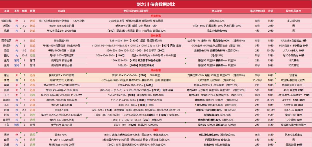 首先本人是新玩家没有参与过内测,但是看了论坛里也没有比较全面的分析,所以我耗时2年半自行分析了一下 1、这个表格不是绝对值,只是相对的分析,个人分析可能有计算不准确的地方,仅供参考,如果你有不同的见解,可以探讨 2、经脉,潜能,技能,数据太多了,所以我写的比较简洁 3、有的数据我没有写上去,比如叶雨时经脉加内防和生命,诸葛是外防和生命,因为所有坦克都是加防,输出都是加30增伤,战士都是加15增伤和