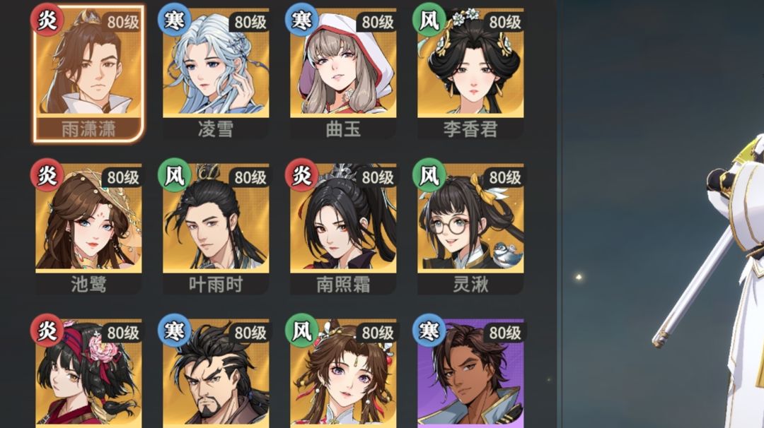 侠客选择 卡牌游戏卡牌当然是最重要的,这里说说我认为比较好用的侠客 - 坦克:叶时雨,霓裳 - 输出:凌雪,耶律红,景辙,姜玲玉 - 辅助:曲玉,池鹭,灵湫,李香君 游戏最多能上阵4个侠客,1个替补,建议选择两个输出(1群体1单体)一个肉一个辅助,替补的话选肉或者辅助。 我认为最适合平民的阵容是霓裳+姜玲玉+凌雪+曲玉,替补叶时雨; 其中霓裳跟姜玲玉都是紫卡比较容易获得,曲玉跟叶时雨可以开自选箱子