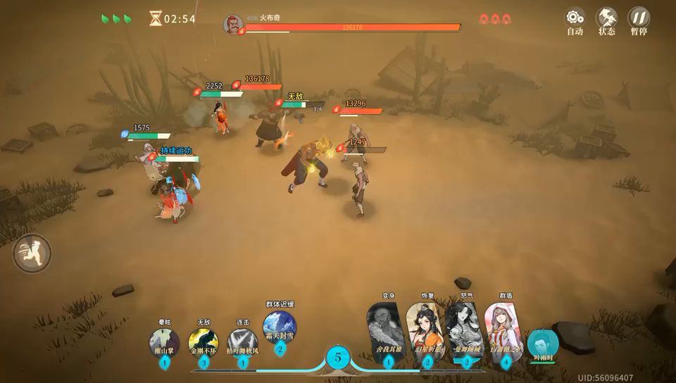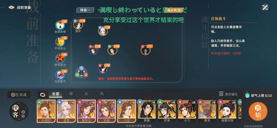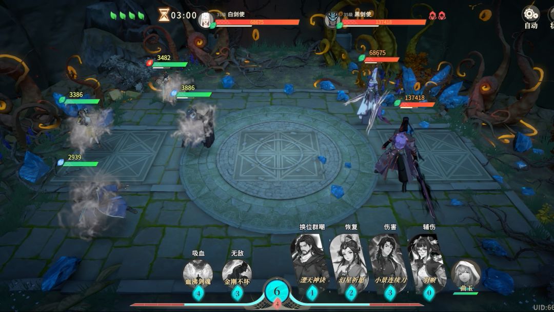关键就是第一个技能霜天封雪,你们带就是,正好可以丢中两个boss,然后你们就会发现破盾效率极高,具体操作就是先打黑,不停给凌雪套加速,盾不要停跳舞不要停,你们看霜天封雪技能就懂了,带这个打黑白很简单,控制白嫖内伤和两连击。丢中两个卡好位置剩下的操作就是循环了。