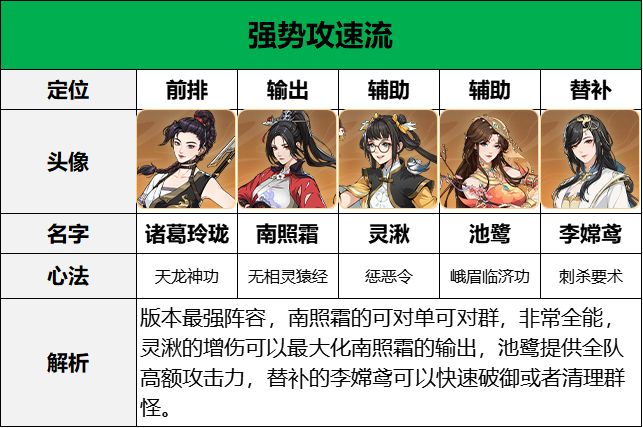 本期为新手配队教学第一期,主讲当前版本的pve强势配队阵容。包含新手过渡阶段的队伍搭配,希望大家可以用强势队伍速通剧情和副本~ 首先就是当前最强的南照霜队伍,各个副本的速通榜基本都是这个阵容。玩起来不想卡关的话,选这个阵容就对了! 开荒阶段优先抽满南照霜,其他队友先用低配版,再慢慢优化队伍。南照霜的pvp表现一般,所以补一个李嫦鸢,这样可以兼顾剧情副本和pvp。 南照霜抽满后,优先抽灵湫,和池鹭,