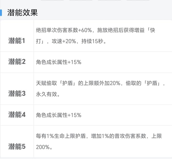 卫宁风5潜的意思推测是攻击系数上限200%,而不是增加200%,也就是90%护盾就满加成。展晏6脉推测意思是本次对战中累计获得护盾量,而不是身上要有那么多护盾,但不妨碍他小丑二连击是最麻烦的机制,每次大更新后都要自己挨个测哪个改了哪个没改连击的默认机制应该是只算作普攻伤害,不增加普攻计数,这个用任意带四次普攻出特效的角色就能试出来,这也是为什么南照霜专武雪风,而大部分角色用不了。连击伤害吃一切加成,也就是完全复制一次普攻,但它虽然不增加普攻计数,却会消耗掉计数型的buff,比如主角带3层普攻必暴打两次连击,第二次连击的第二次伤害就没有暴击了,但buff栏里的必暴还在上面说连击的设计初衷应该是不增加计数的,然而实际却存在一些bug,能打出额外伤害,鉴于论坛里有官方人员,我不会说的附一个没用的冷知识,卫宁风普攻是独特的二段伤害,但跟南照霜的真二段不一样,她这个二段是单纯的税后伤害➗2显示,无任何实际用途